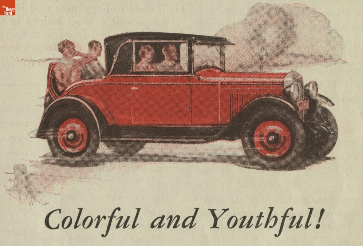 Chevrolet was "colorful and youthful" for 1928, with a bigger body on a wheelbase that grew four inches from the previous model year. Two-door roadsters, like the one shown in this ad, started at $495, while four-door sedans started at $675. Chevrolet built 1.2 million cars in 1928.