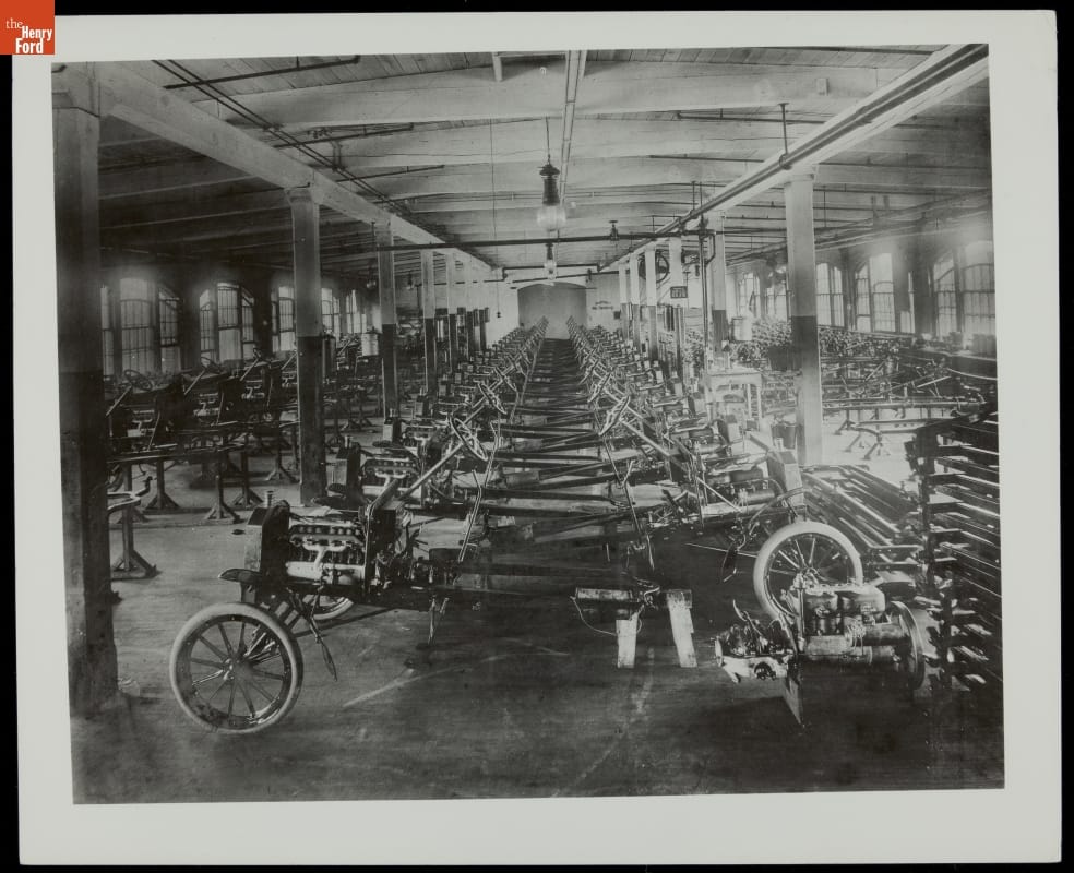 In 1906 Ford Model Ns were assembled on the third floor of Ford Motor Company's Piquette Avenue factory in Detroit. Cars were put together by crews moving from vehicle to vehicle. No one had yet conceived of the moving assembly line. The chassis were stored in tight lines to conserve space.