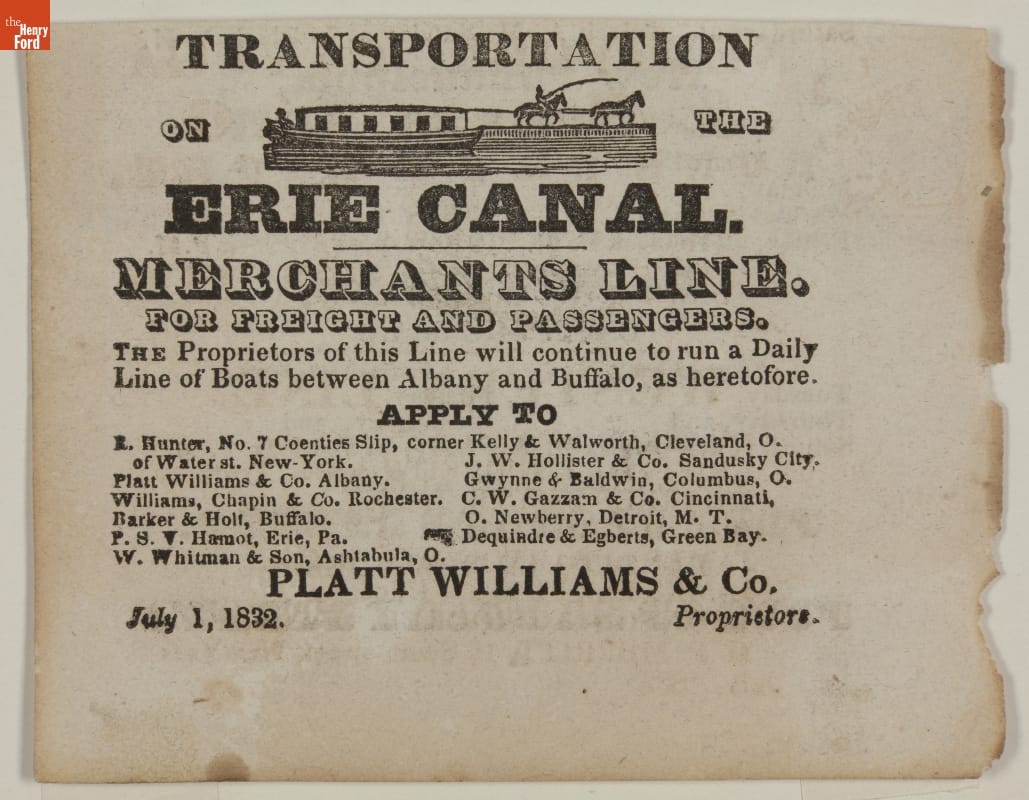 The first half of the 19th century was the heyday of canals in the United States, opening up new territories to settlement and commerce. The Erie Canal, connecting Albany to Buffalo, began in 1817 and was completed in 1825. This broadside, printed July 1, 1832, advertised the "Merchants Line" of boats, a daily line that transported freight and passengers.
