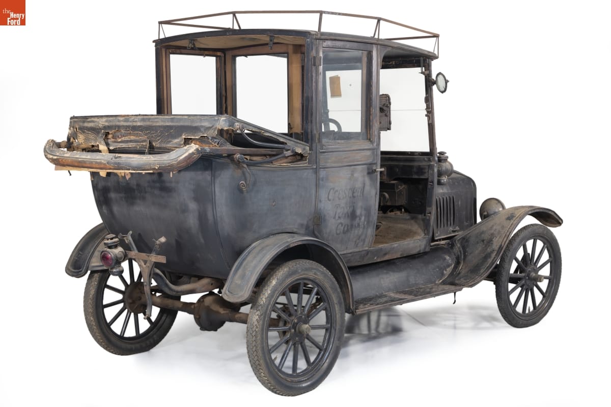 The ever-versatile Ford Model T could be adapted for taxicab service. Taxi drivers appreciated the same qualities that made the Model T so appealing to private owners: its low price and modest operating costs. This cab features a landaulet body -- with a fixed roof for the driver and a convertible roof for the passengers.