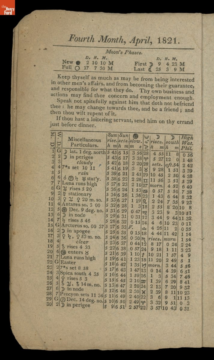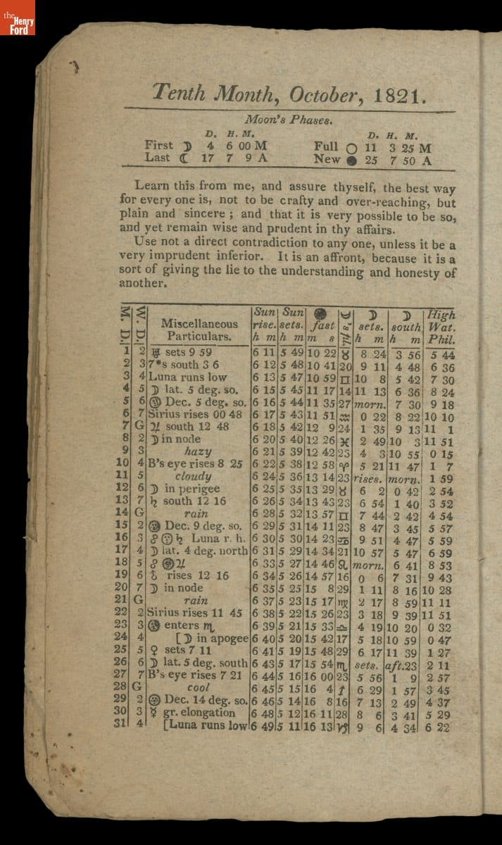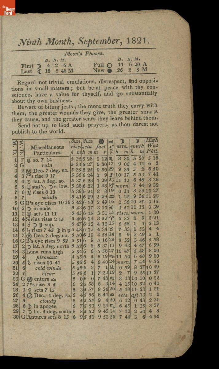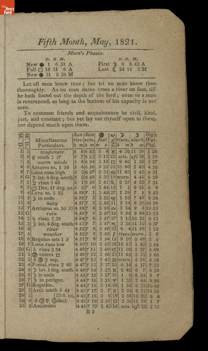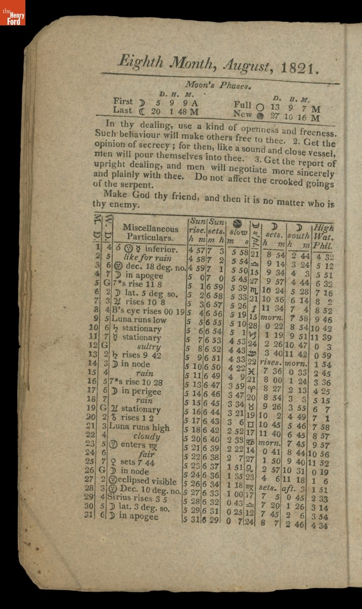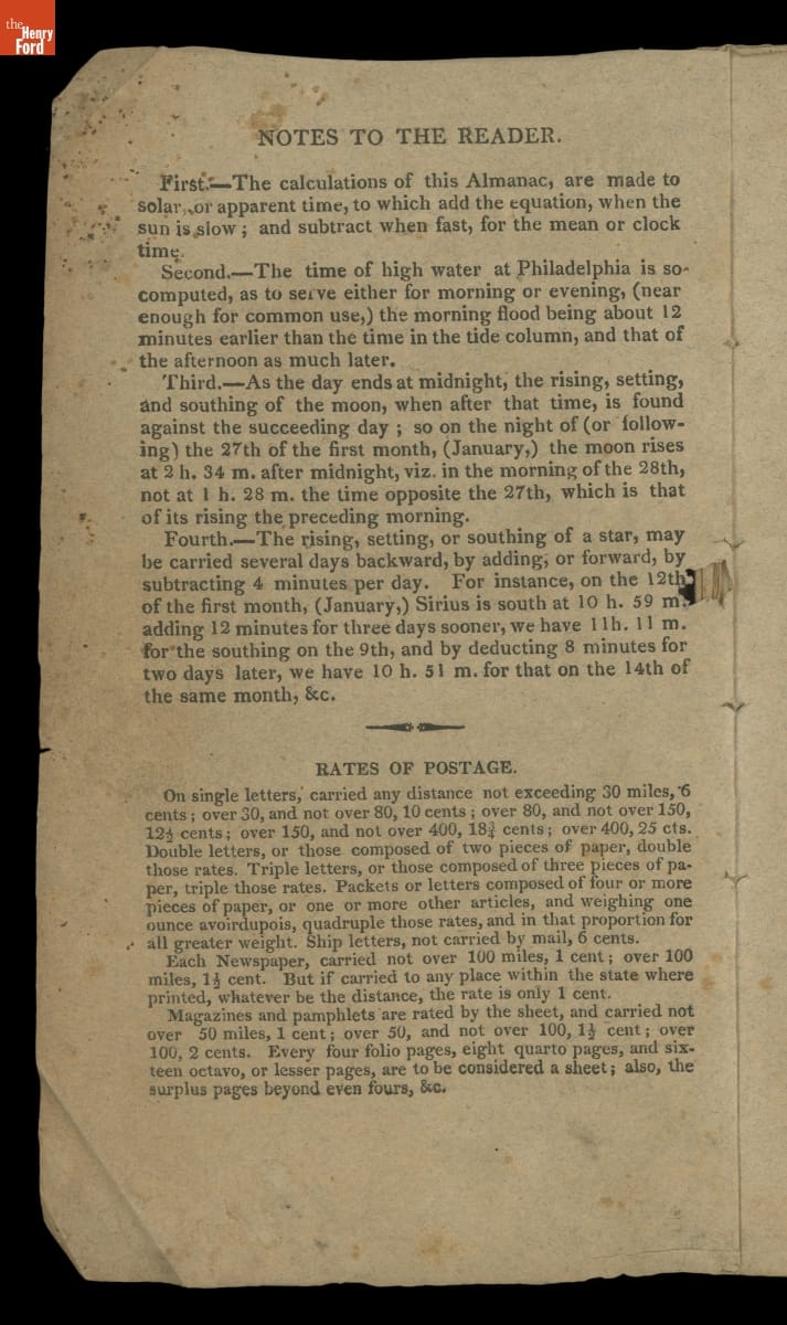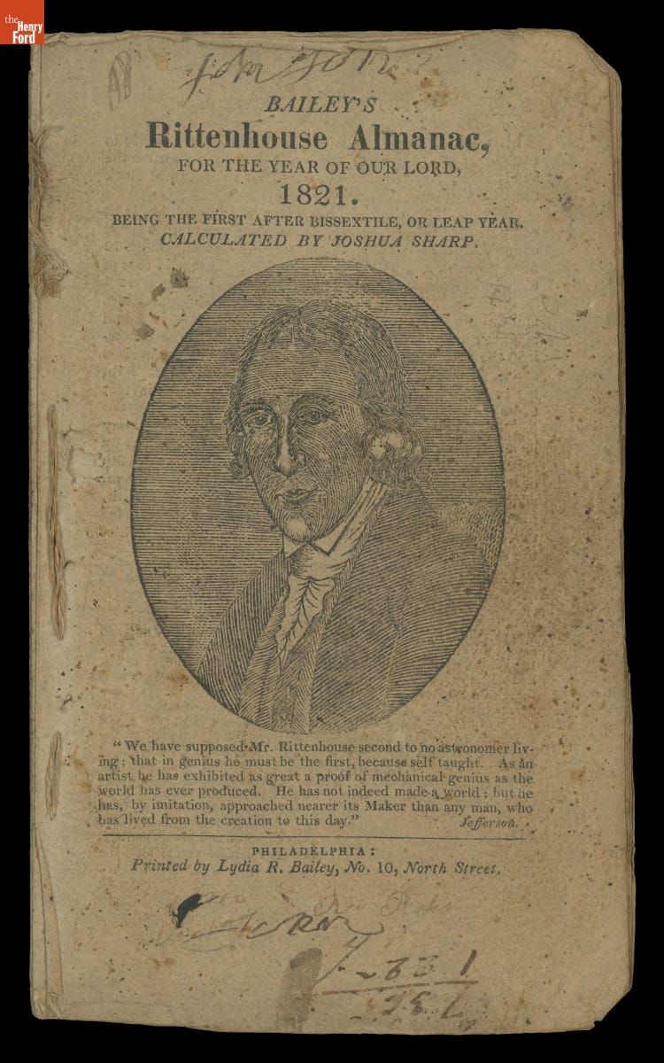 Bailey's Rittenhouse Almanac, named for the noted astronomer David Rittenhouse (1732-1796), was a Philadelphia-focused almanac providing astronomical calculations (times of sunrises and sets, the tides, moon phases, and eclipses, etc.) The almanac also provided remedies, recipes, court schedules, and bits of sage advice among its pages. The almanac's printer, Lydia Bailey, operated one of Philadelphia's largest printing shops.