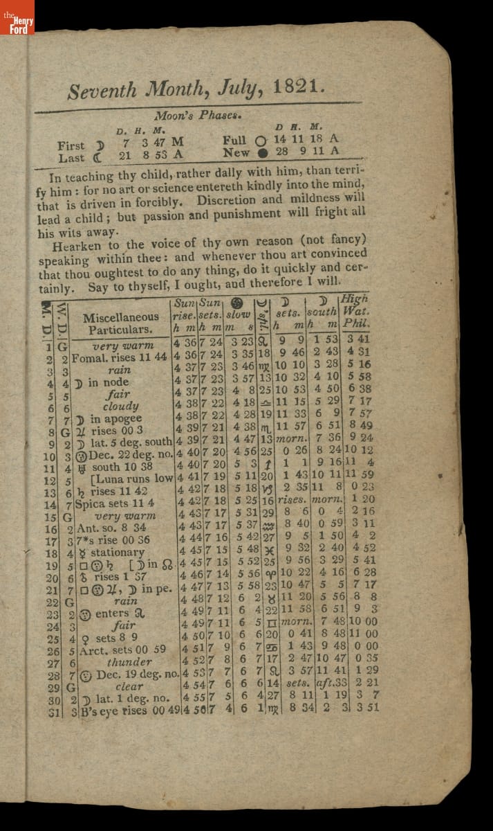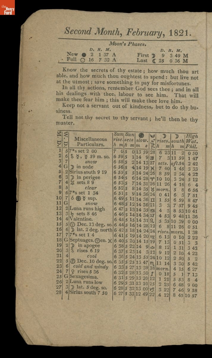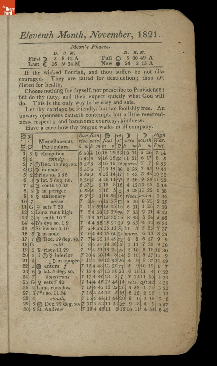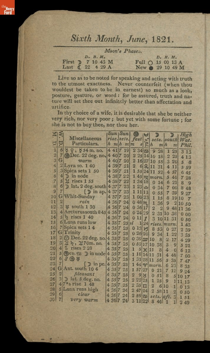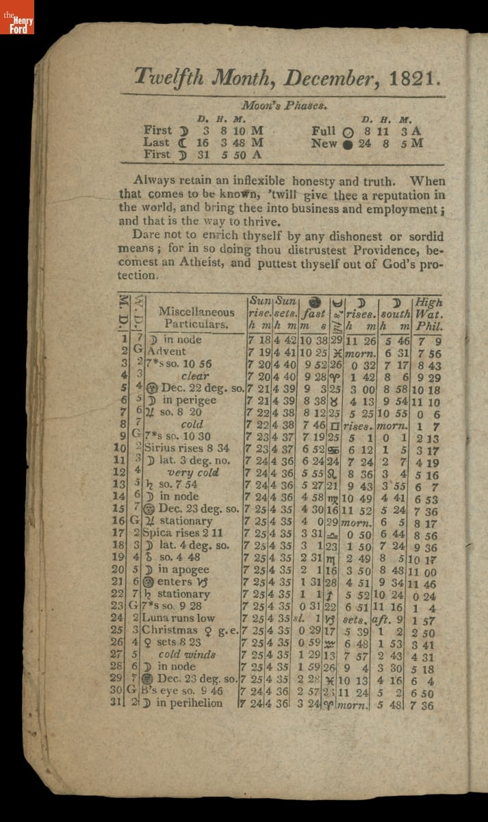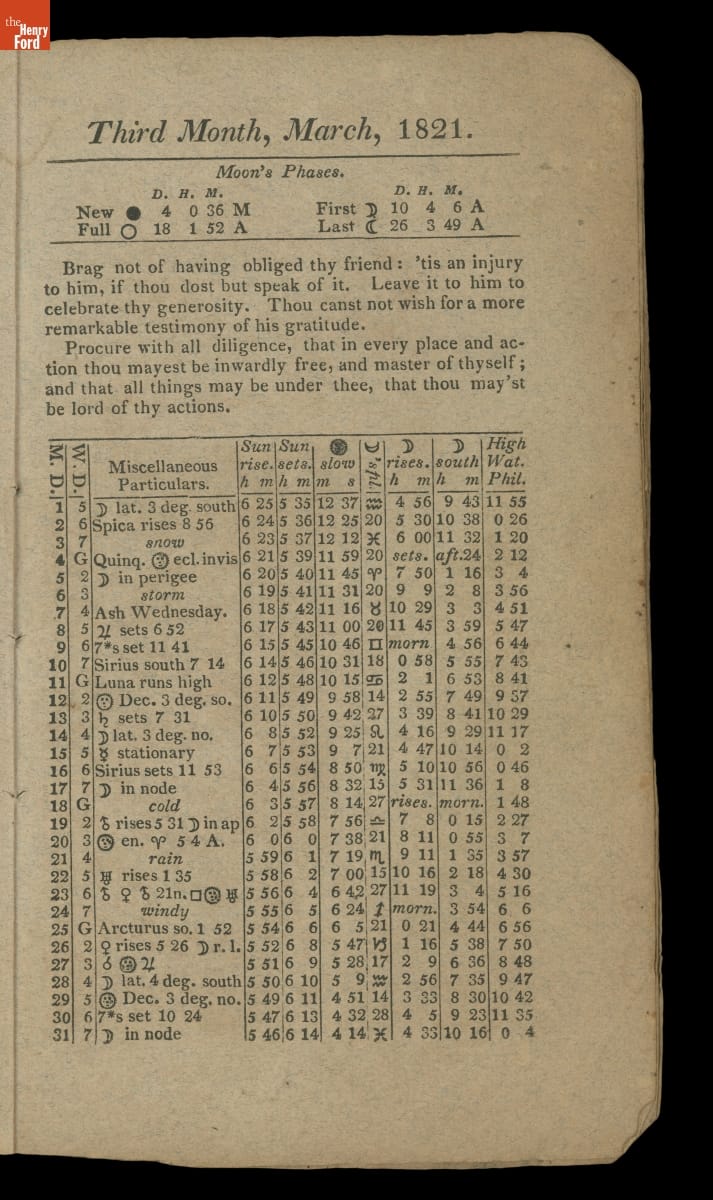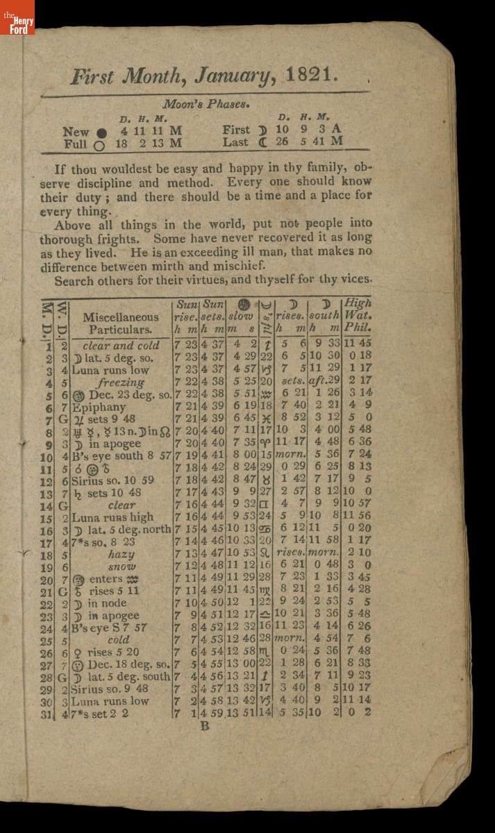 Bailey's Rittenhouse Almanac, named for the noted astronomer David Rittenhouse (1732-1796), was a Philadelphia-focused almanac providing astronomical calculations (times of sunrises and sets, the tides, moon phases, and eclipses, etc.) The almanac also provided remedies, recipes, court schedules, and bits of sage advice among its pages. The almanac's printer, Lydia Bailey, operated one of Philadelphia's largest printing shops.