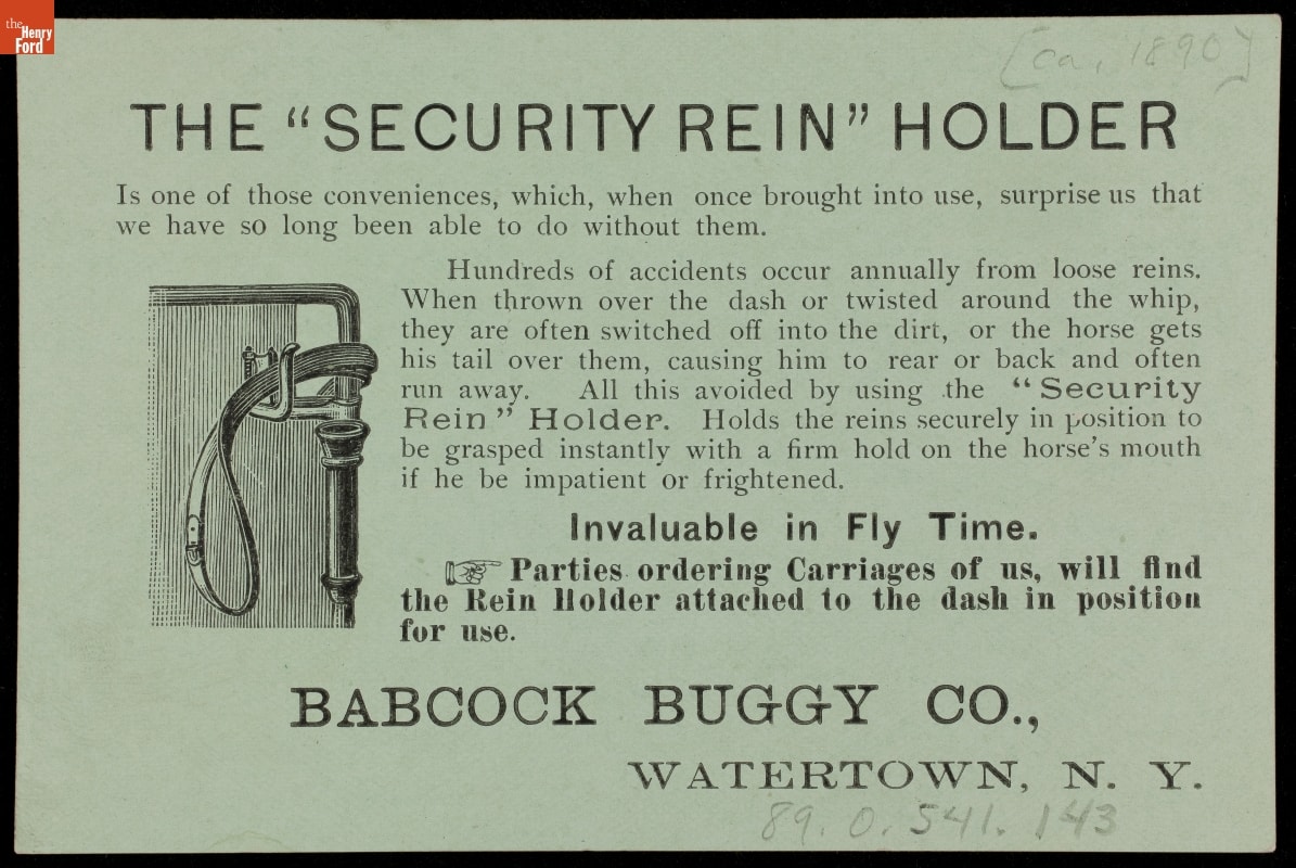 This card advertises the Thomson Security Rein Holder, which kept a horse's reins within easy reach but did not require the driver to hold them. As the number of horse-drawn vehicles sold in the U.S. grew over the 19th century, so did the variety of accessories available for them. Safety is the major selling point used in this ad.