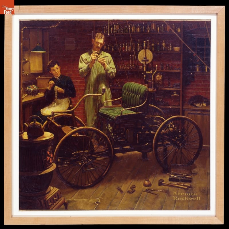 In this painting Norman Rockwell gives us an idealized view of Henry Ford building his first automobile in 1896. In a small brick shed behind the Fords' rented home on Bagley Avenue in Detroit, Henry fine tunes a part of the car while his wife Clara looks on, darning socks. The reality was somewhat different. Henry built the little car with the aid of several friends, and much of the work was done in a shop near Ford's place of work, an electrical generating station. This is one of a series of eight paintings Ford Motor Company commissioned Rockwell to do in anticipation of the company's 50th anniversary in 1953.