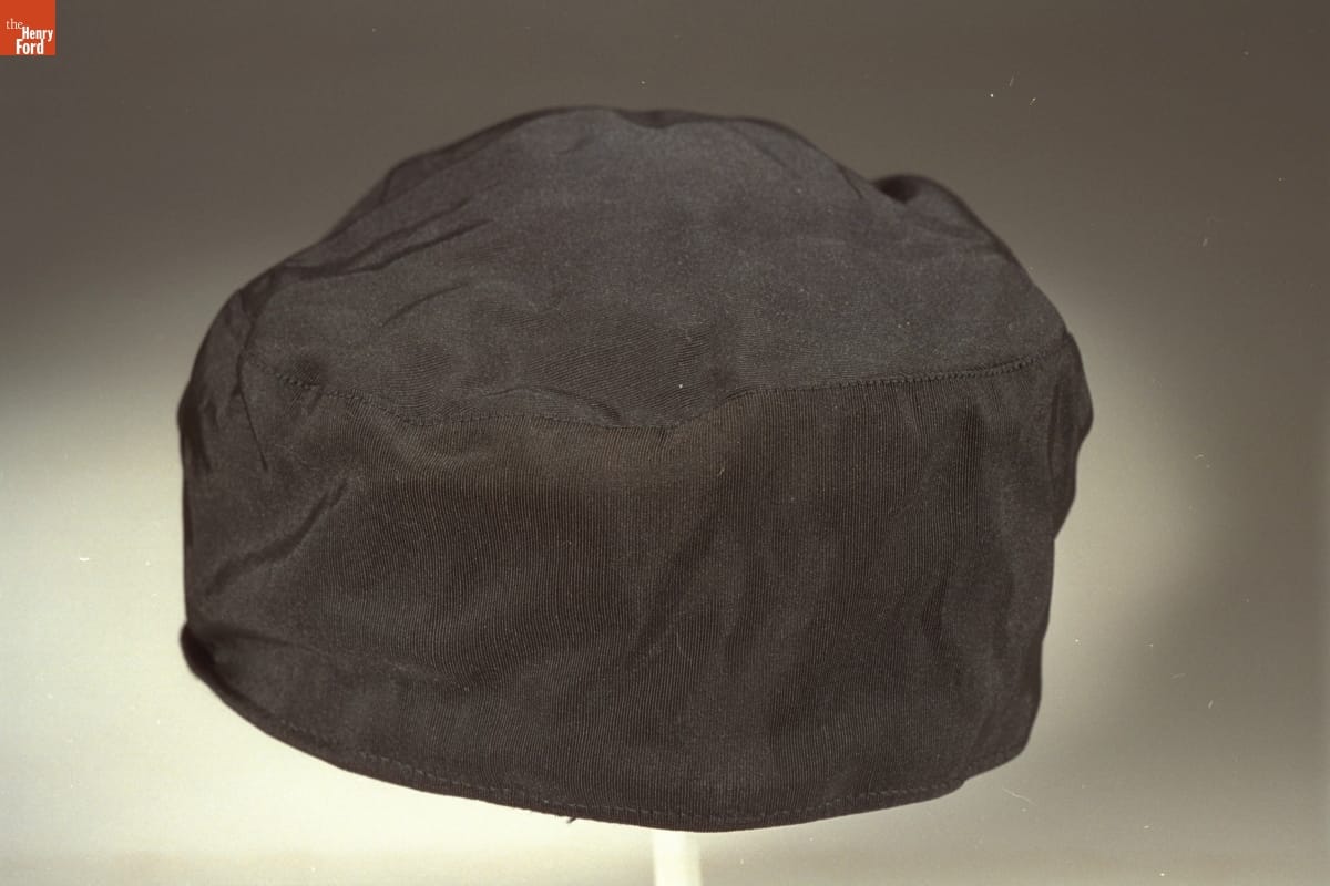 During the late 1800s and early 1900s men wore simple, close-fitting, brimless caps like this when working outside or in laboratories, factories or workshops. These caps protected the hair from dirt and debris and kept the head warm.