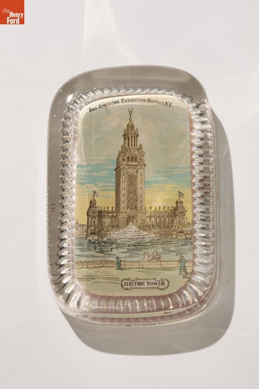 In 1901, visitors to the Pan-American Exposition in Buffalo, New York, could purchase a variety of souvenir and decorative items. These mementos usually contain the name of the fair and a view of a prominent building. This glass paperweight displays the fair's Electric Tower. Keepsakes like this provided a lasting remembrance of the fairgoer's trip.