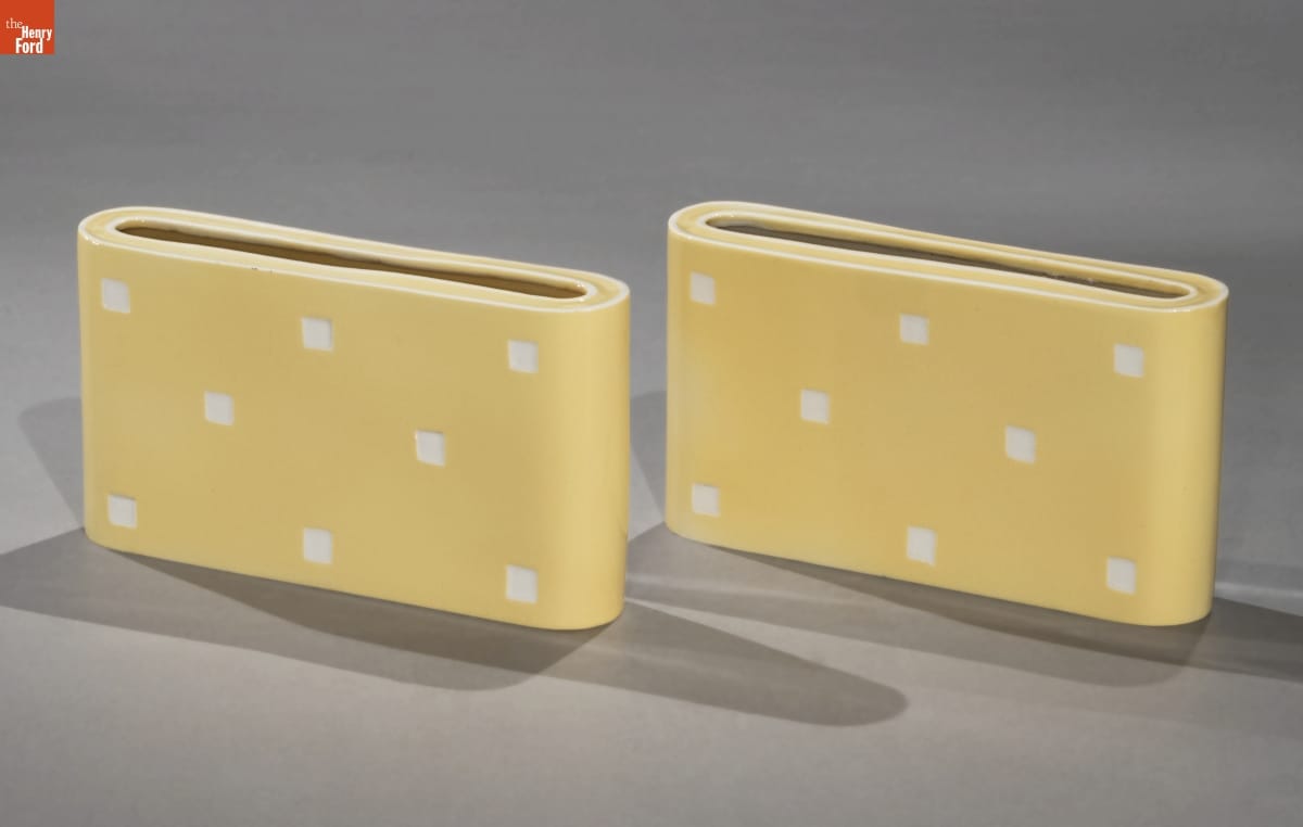 Waylande Gregory was known for his large-scale ceramic sculptures. The most famous, the Fountain of the Atom, was produced for the 1939 New York World's Fair. In the late 1930s he began producing decorative table wares for high-end department stores. This pair of vases was used by Edsel and Eleanor Ford on their yacht, Onika.