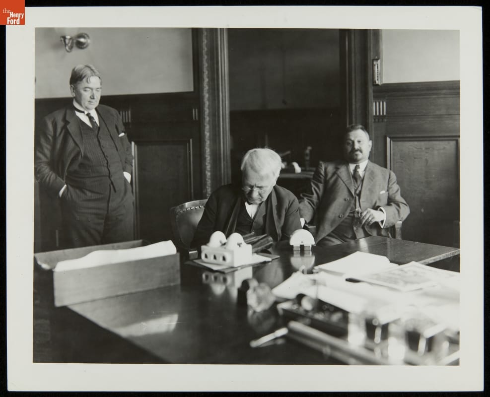 Arthur Williams, Thomas A. Edison and John Leib at Edison Consolidated of New York Offices, 1908
