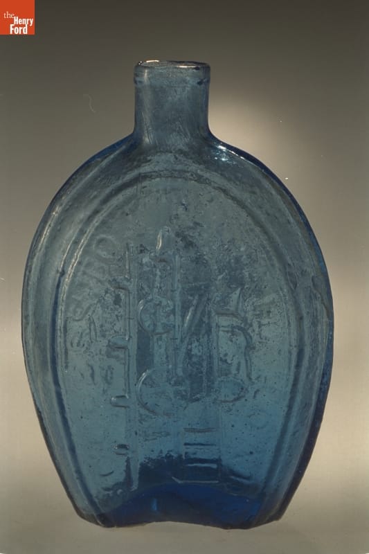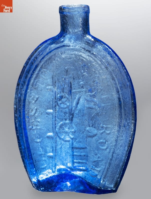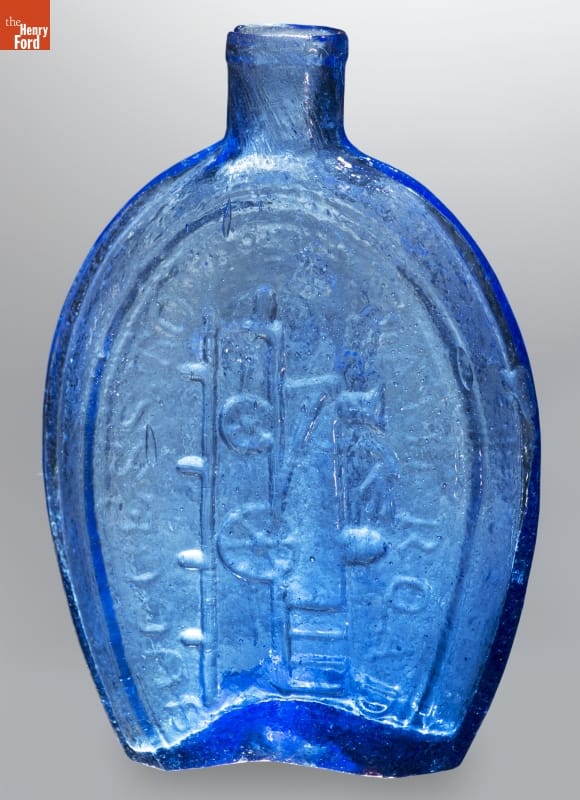 Glass factories in America began producing inexpensive, mold-formed flasks in the early 1800s. These figured flasks, often decorated with symbols of national pride or political or cultural affiliation, appealed to America's common man. Americans' fascination with railroads began in the late 1820s when rail lines began connecting distant communities. This flask depicts a steam engine with the phrase "Success to the Railroad."