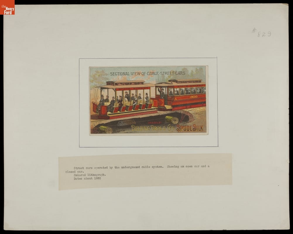 Lithograph Advertising Belding Bros. & Co. Silk Thread, "Sectional View of Cable Street Cars," circa 1880