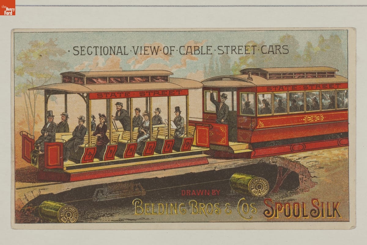 This print shows a cutaway of Chicago City Railways' State Street cable car line. In the 1880s Chicago transit companies invested heavily in cable railways, but most had switched to electric streetcars by 1900. Belding Brothers, a leading manufacturer of silk thread, put the strong fiber to work pulling cable cars-but most transit companies eventually settled on cheap, sturdy wire rope.