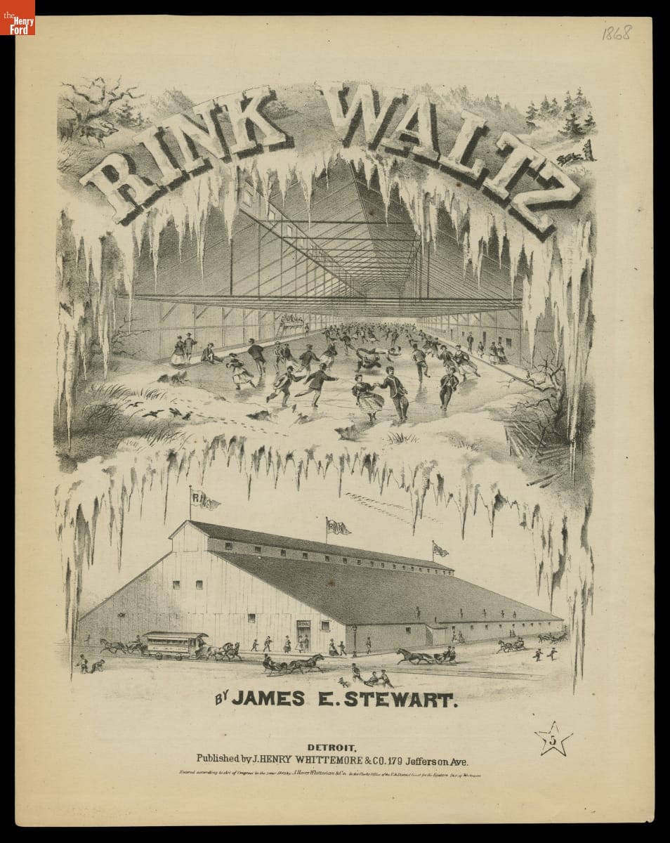 Ice skating became popular in the United States in the second half of the 19th century. Many indoor rinks opened across the United States, offering skating with live musical accompaniment. This song was written and published in Detroit in 1868, with cover illustrations of the interior and exterior of the Detroit Skating Rink, which opened in 1866.