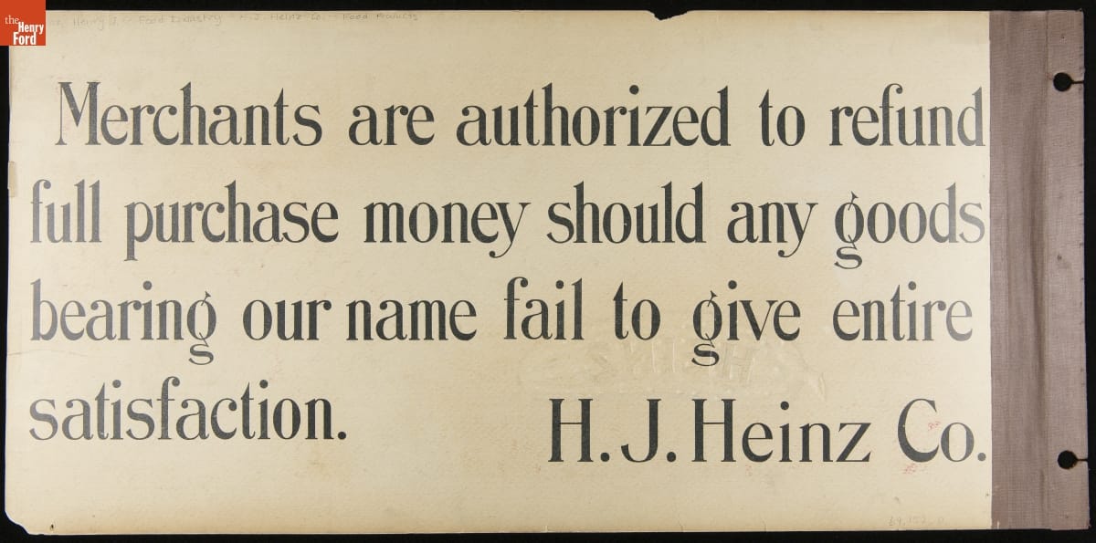 Merchants are authorized to refund full purchase money should any bearing our name fail to give entire satisfaction. H.J. Heinz Co.
