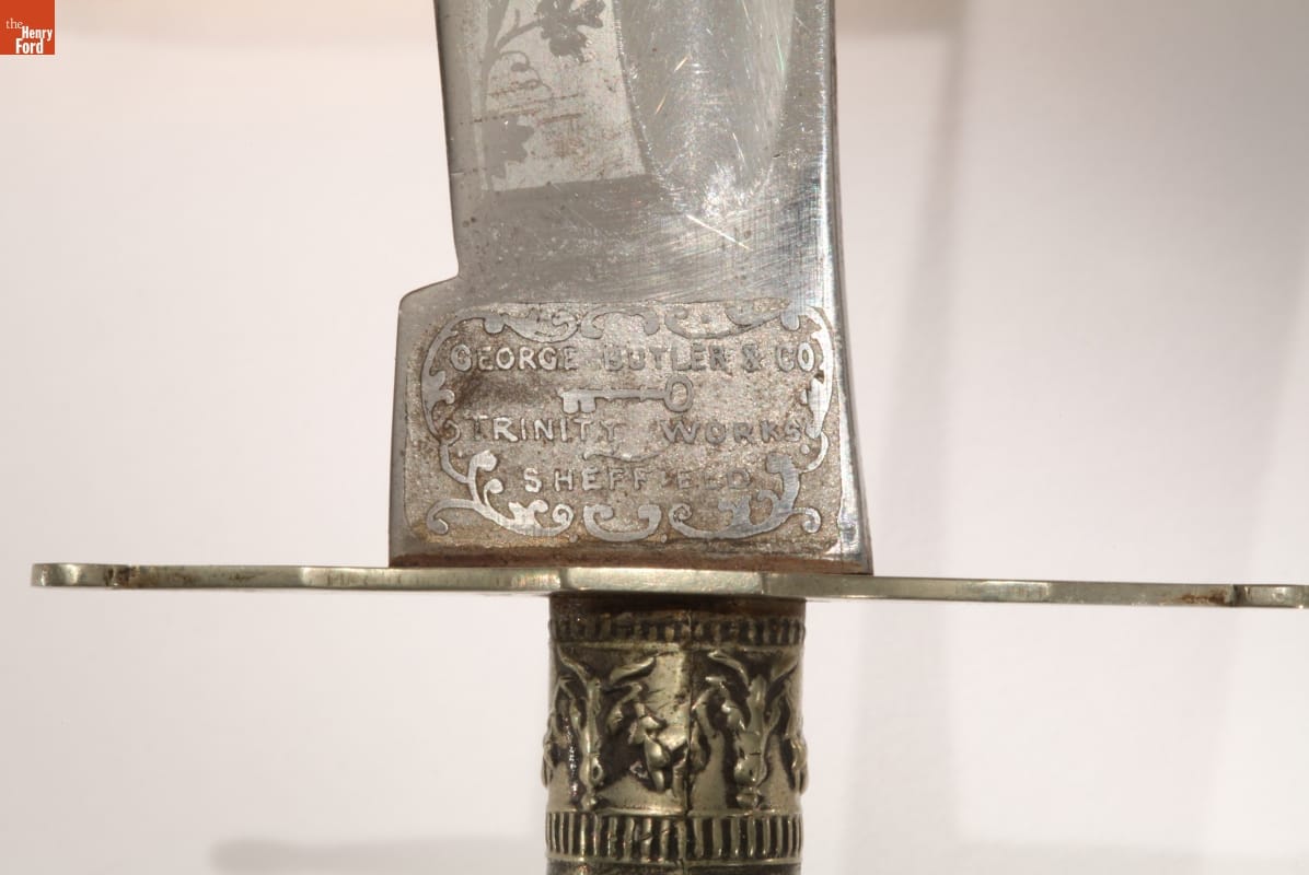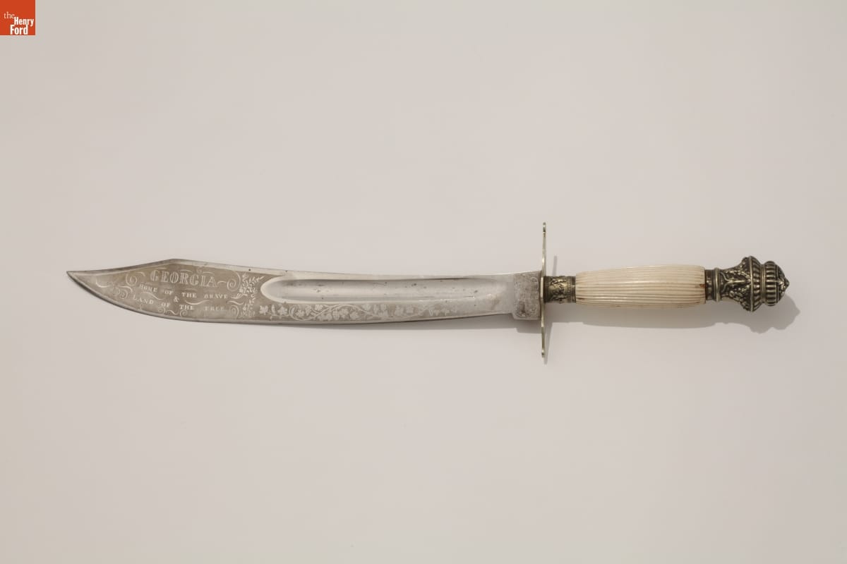 The Bowie knife developed from Spanish hunting knives, but in the 1830s Arkansan frontiersman, and Alamo martyr, Jim Bowie made it famous as a fighting knife. Some Bowie knives were made in the United States; most were made by cutlery-makers in Sheffield, England, who capitalized on their popularity. This knife is etched with patriotic words about the state of Georgia.