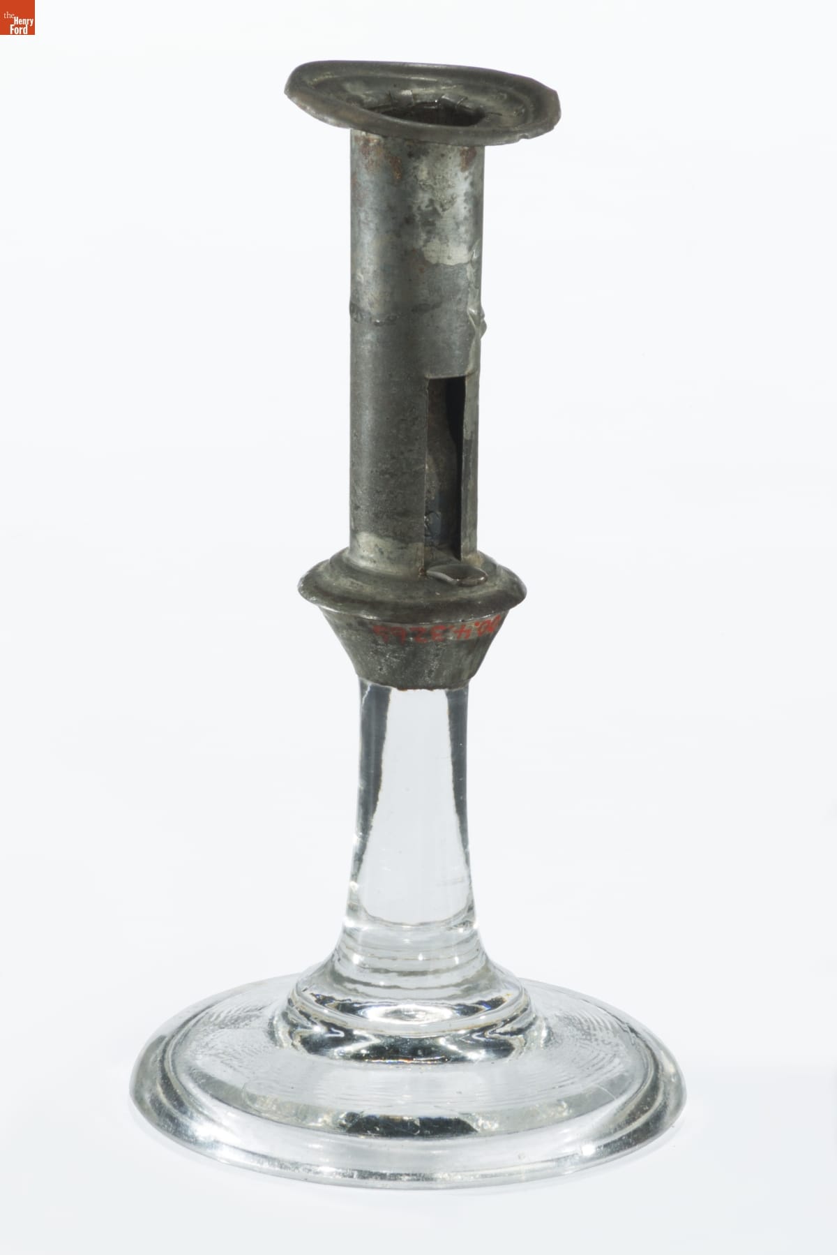 Traditional make-dos are useful and precious objects that broke during their working lives. Their owners felt compelled to restore or repurpose these objects in a variety of ways. Someone fashioned a tin socket and joined it to this glass base to create usable candlestick.