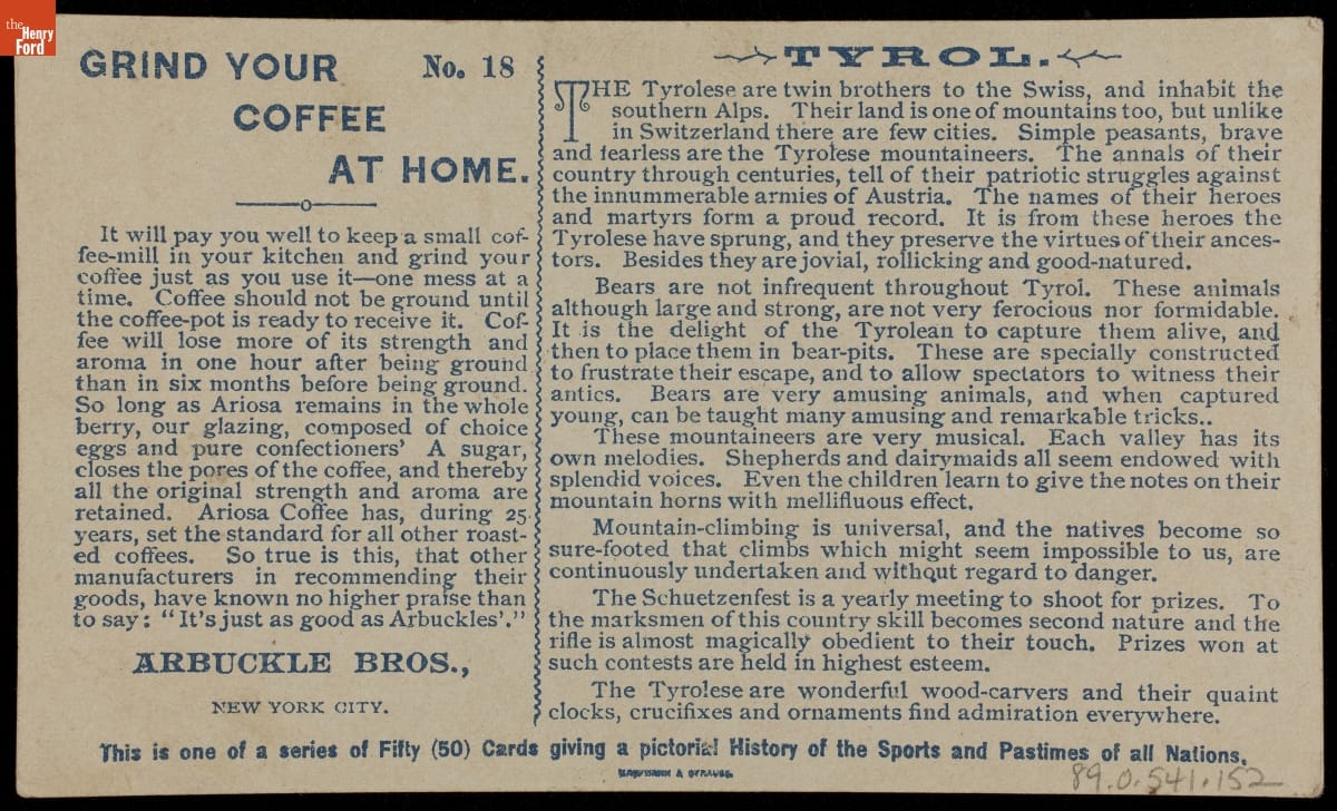 Grocers sold coffee in bulk when John and Charles Arbuckle came up with an innovative process for individually packaging different grades of coffee. Their popular Ariosa coffee beans were glazed with a sugar and egg coating supposedly to improve quality and flavor. This trade card, from the Chicago Columbian Exposition, was in a series depicting different nations' sports and pastimes.