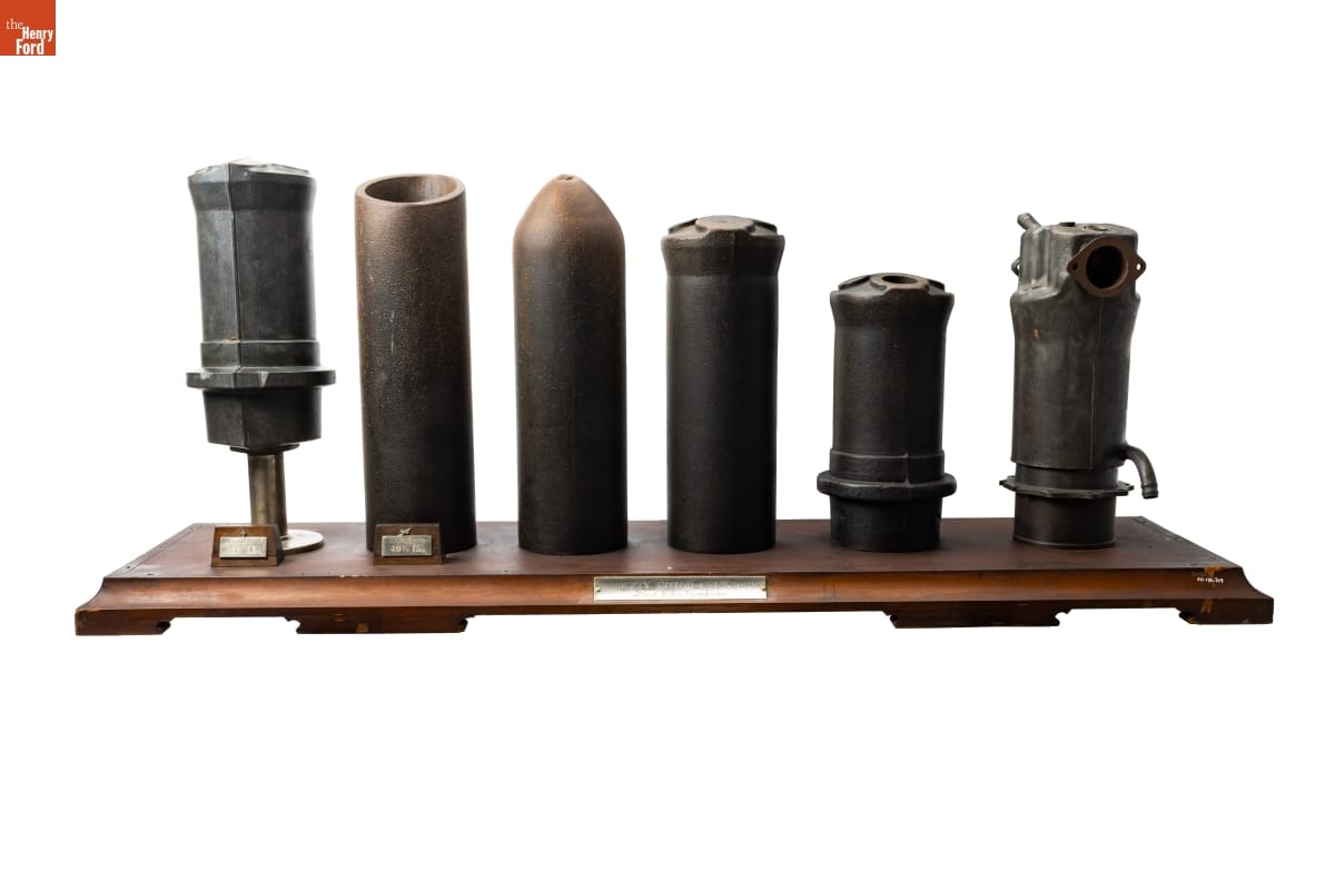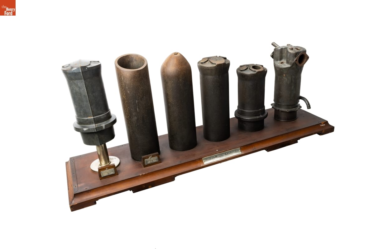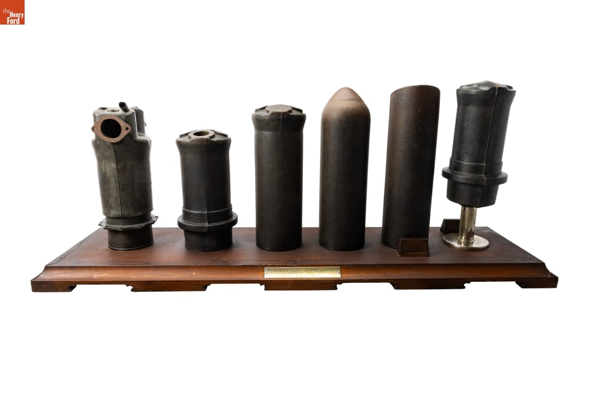 Ford, Buick, Cadillac, Lincoln, Marmon, and Packard built more than 20,000 Liberty V-12 aircraft engines for the Allied Powers during World War I. Ford produced the engine cylinders for all manufacturers. The company developed a new method for making cylinders from steel tubing rather than boring them from solid forgings. These examples contrast Ford's process with a forged cylinder.