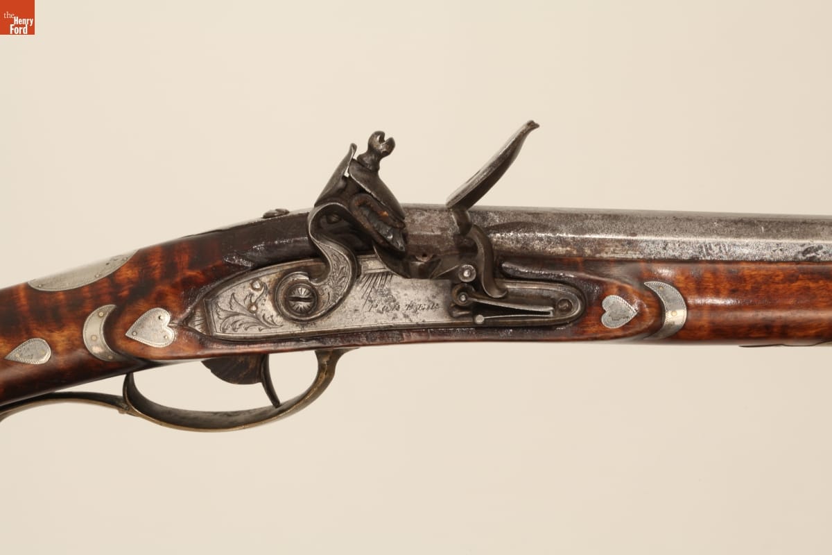This is a splendid example of a Pennsylvania-made long rifle, a specialty of German immigrant communities. With over forty decorative inlays depicting eagles, shields, hearts, and abstract decorations, this rifle is an elaborate work of art, no doubt viewed with pride by its owner, perhaps a member of a Pennsylvania militia.