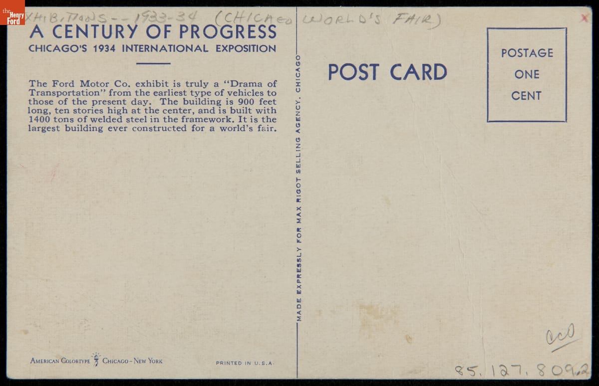 Postcard, Ford Exhibition Building at "A Century of Progress International Exposition," Chicago, Illinois, 1934