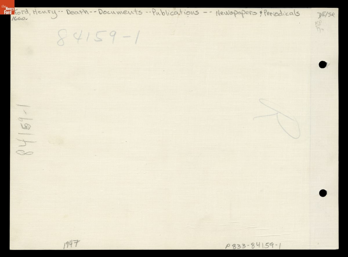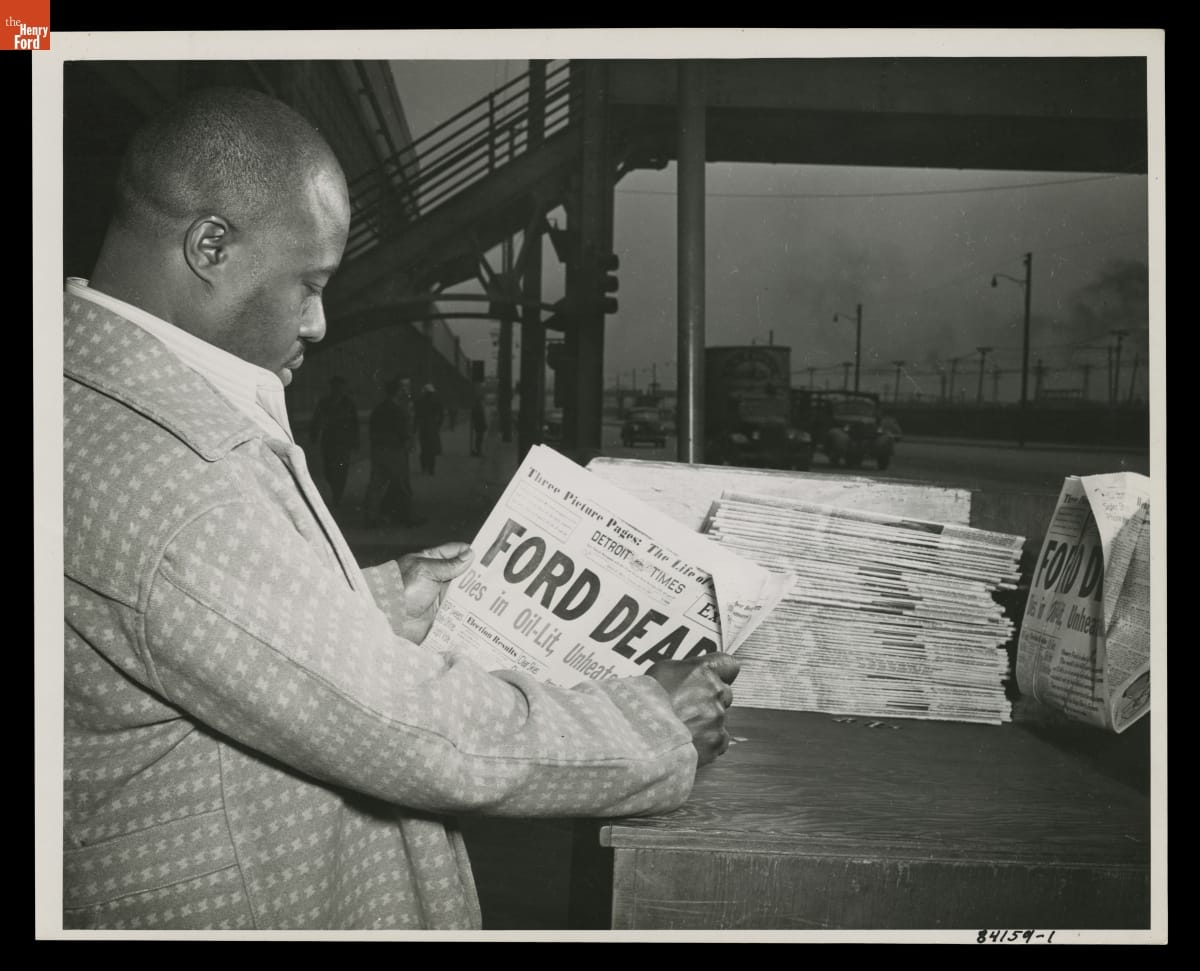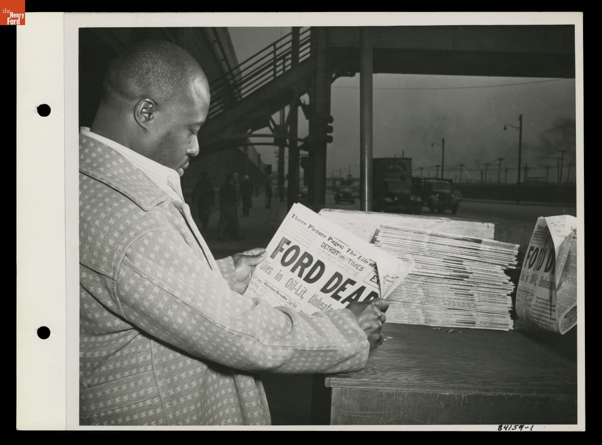 Man Reading the Detroit Times Newspaper with Headline "Ford Dead," April 8, 1947