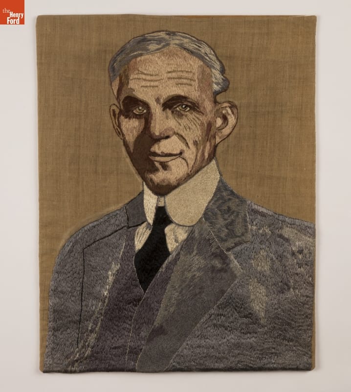 Acknowledging Henry Ford's innovative spirit, individuals employing their own original and imaginative efforts bestowed hundreds of handmade gifts upon him. This finely executed likeness of the automotive industrialist is an example of needlework sometimes referred to as thread painting.