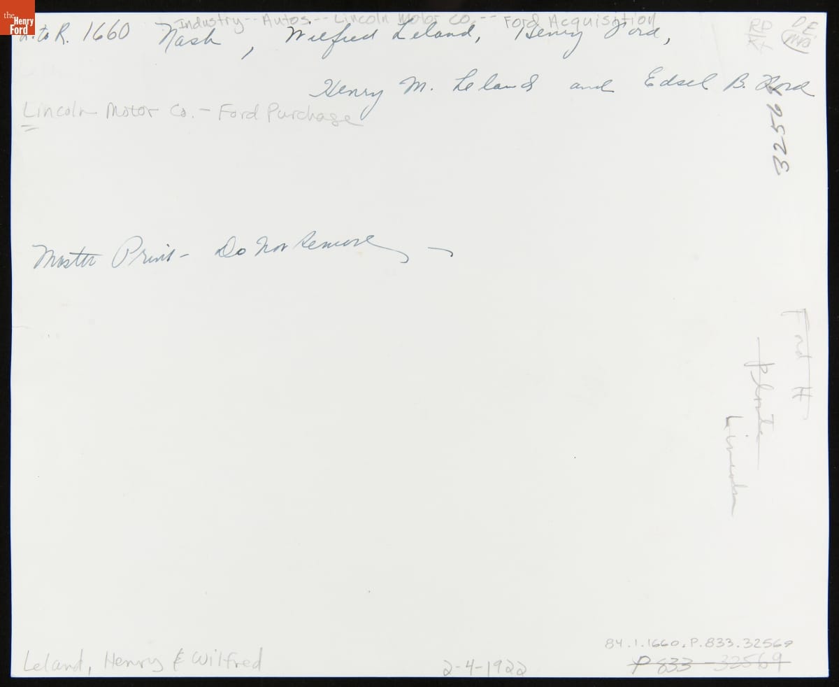 Ford Motor Company purchased Lincoln Motor Company for $8 million in 1922. The deal was formalized on February 4 of that year with a ceremony at Lincoln's factory in Detroit. During the event, several people from both companies posed for a portrait outside the Lincoln plant.
