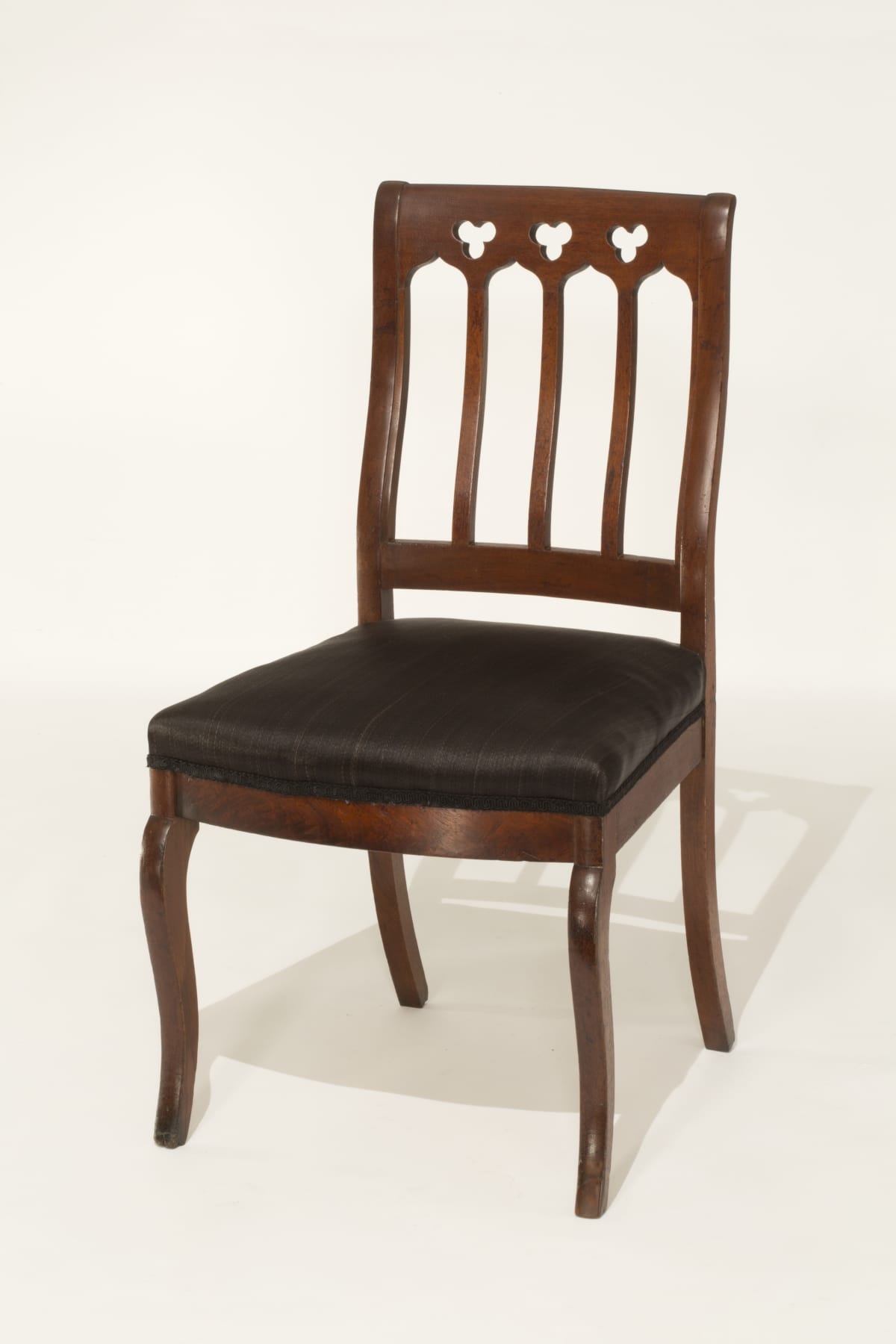 Meeks and Sons work spanned the 1820s to around 1860, when technology transformed furniture making from a craft to an industry. This chair dates from the 1830s, an example of the Gothic Revival style. Note the three part cut outs, known as trefoils above pointed arches, derived from medieval stained glass windows.