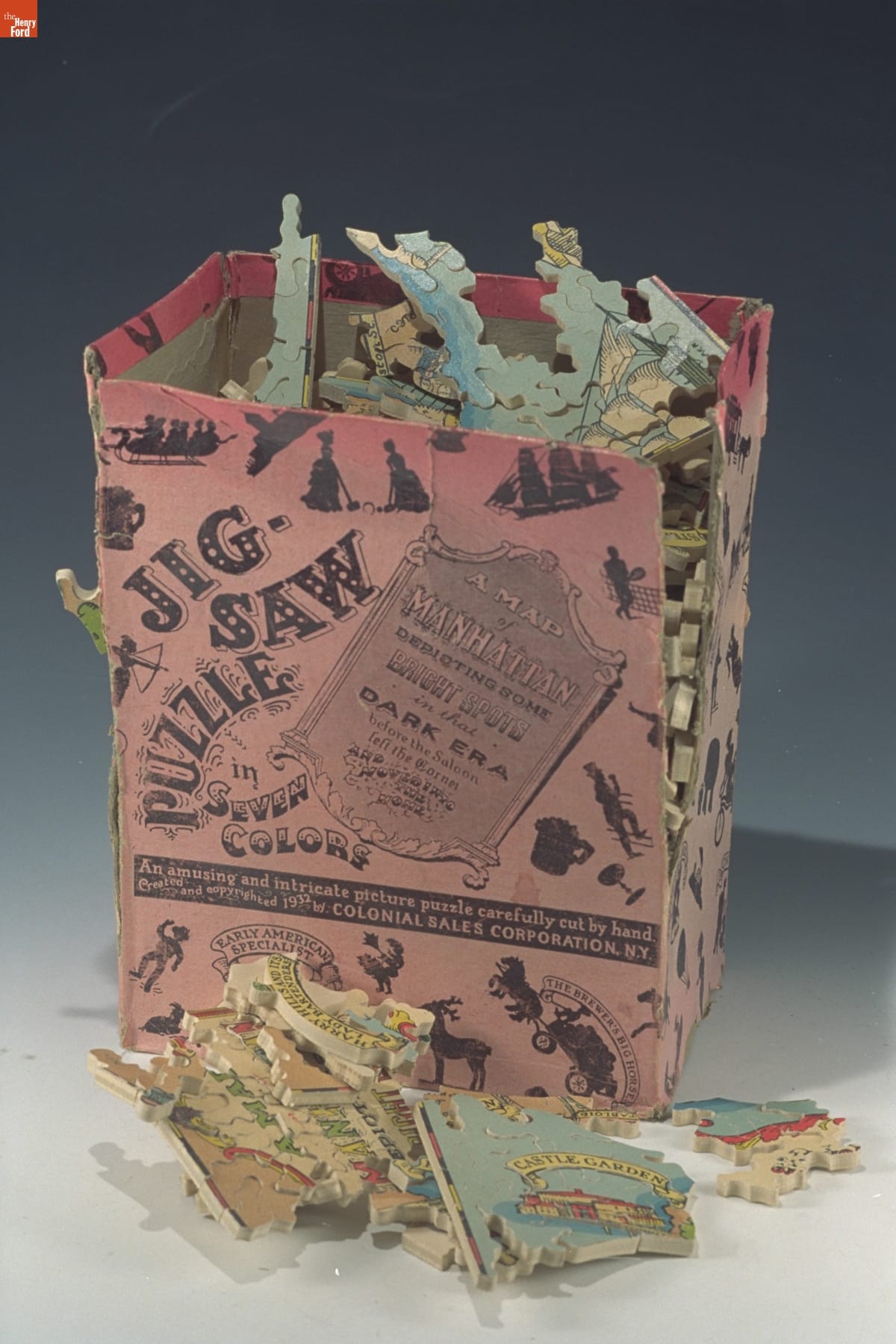 front of box; upper right hand corner of puzzle, printed: A Map of Manhattan Depicting some Bright Spots in that Dark Era before the Saloon Left the Corner and Moved into the Home