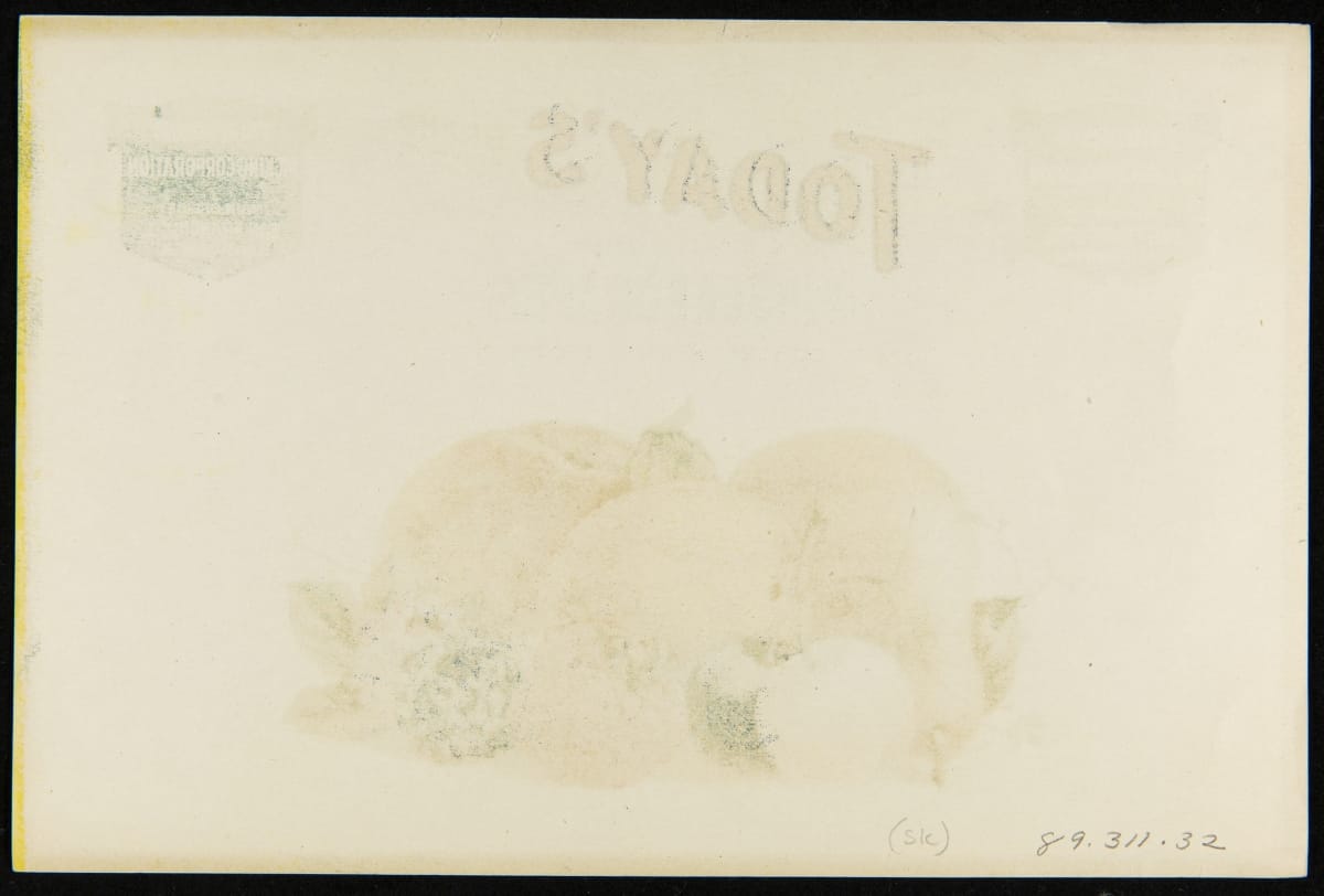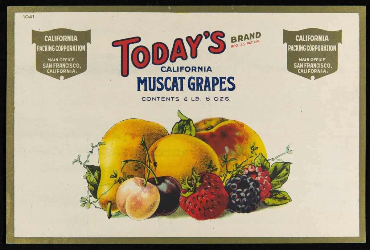 In 1869, the transcontinental railroad opened eastern markets to the West Coast produce industry for the first time. As produce companies shipped crates of fruits and vegetables across the country, they needed a way to distinguish their goods from their competitors'. Colorful, eye-catching labels, like this one for Today's Brand California Muscat Grapes, were created to attract grocers purchasing goods from wholesale markets.