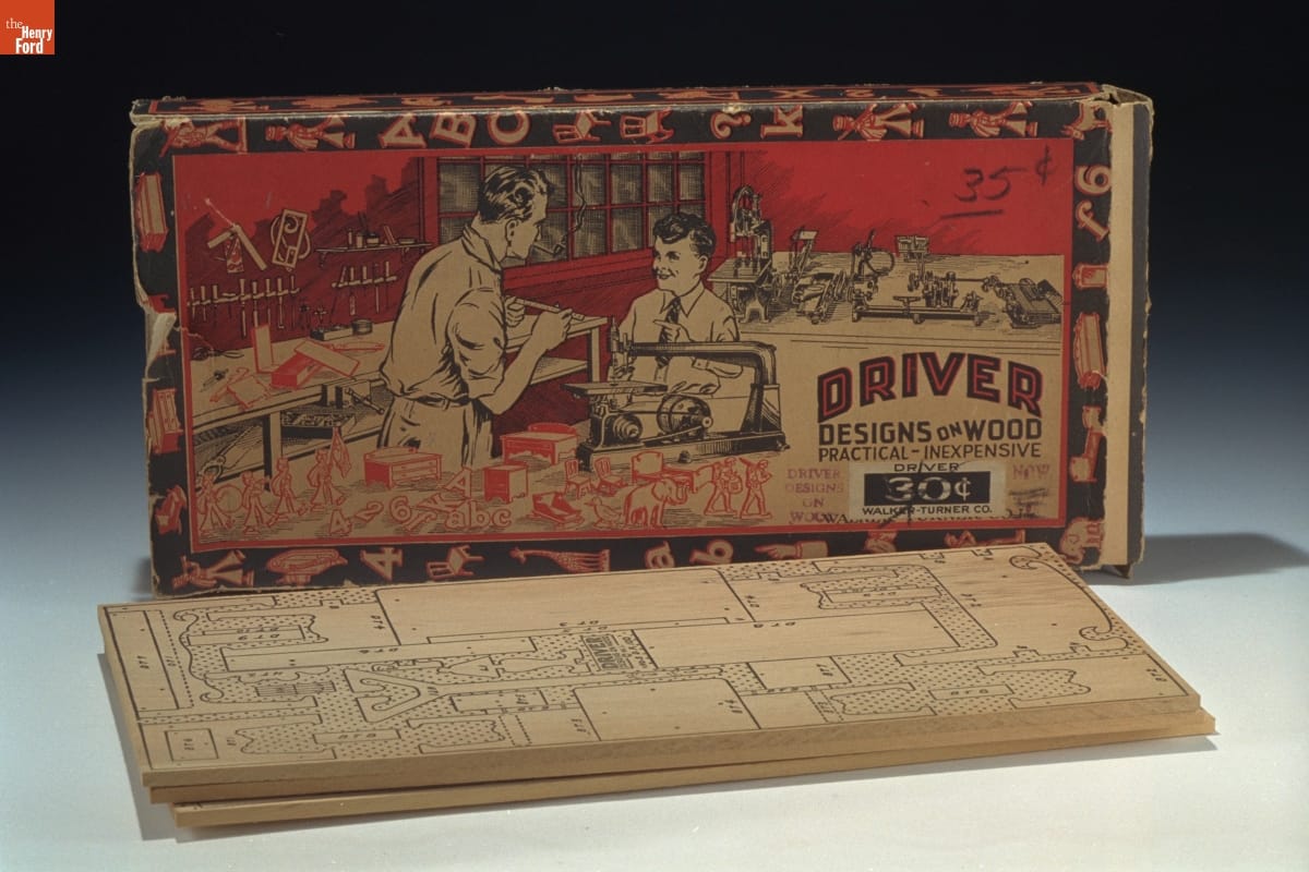 This box contains wooden pieces and instructions for building a set of doll's bedroom furniture. The Depression-era kit encouraged men and boys to learn the art of woodworking at home, and was intended to increase sales of the company's Driver Jig Saws.