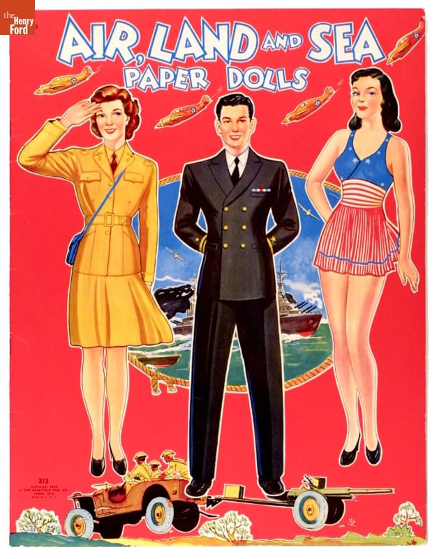 The Saalfield Publishing Company was founded in 1900, at first producing dictionaries and Bibles. The first Saalfield paper dolls were produced in 1918. Military toys and play sets became particularly popular during and just after World War II, when patriotism was especially strong, as evidenced by this set from 1943.