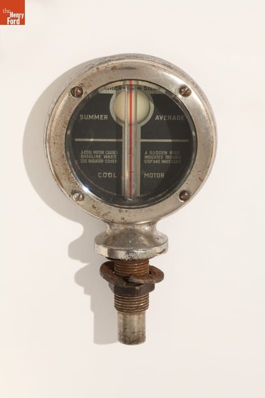 Automobiles often came without temperature gauges before the early 1930s, so enterprising manufacturers sold aftermarket motometers. Mounted on a car's radiator, these devices measured and displayed coolant water vapor temperature, notifying drivers if their automobiles were in danger of overheating. Moto-Meter Co. Inc. dominated the American market, producing the popular Boyce motometer and others featuring an automotive manufacturer's name or logo.