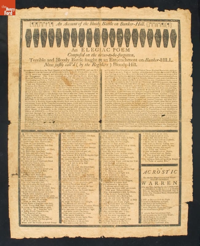 This broadside dates from the beginning of the American Revolutionary War. It recounts the Battle of Bunker Hill, where American rebels repulsed two British assaults before losing their position near Boston. British victory was costly, and colonists commemorated the encouraging clash with a poem and acrostic dedicated to Joseph Warren - a leading Patriot killed in action at Bunker Hill.