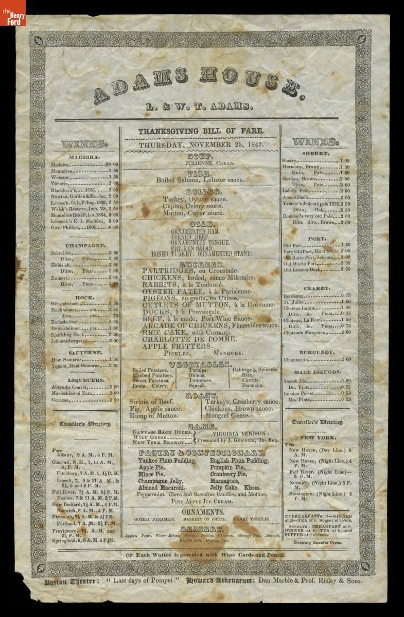 Thanksgiving Menu from the Adams House, Boston, Massachusetts, November 1847