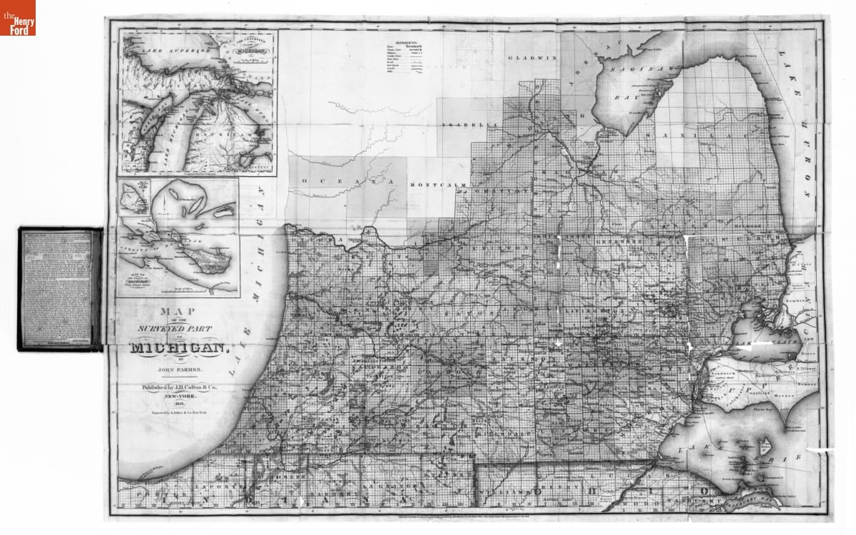 This map shows Michigan in 1837, the year the territory achieved statehood. It presents the southern portion of the Lower Peninsula -- where most cities and towns were located at the time -- in detail, while northern areas including the Upper Peninsula are shown in insets. The important area around the Straits of Mackinac has its own inset as well.