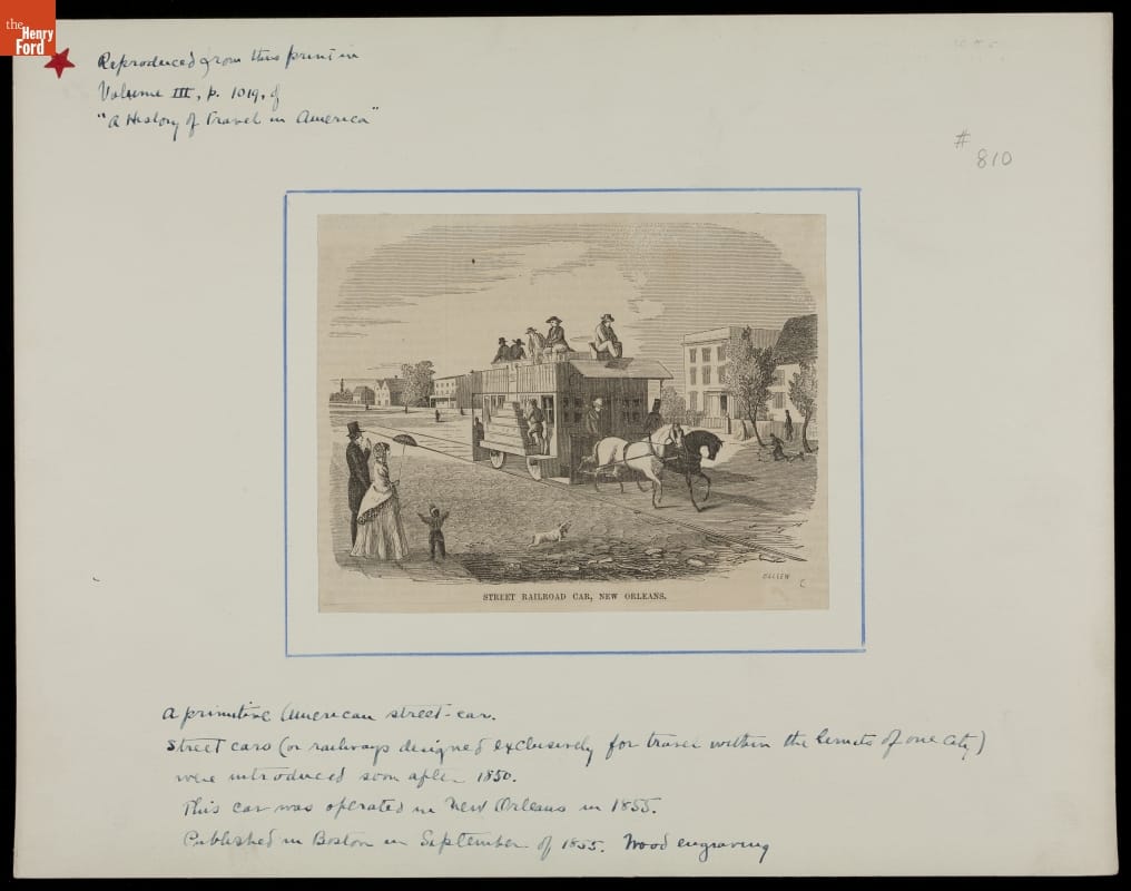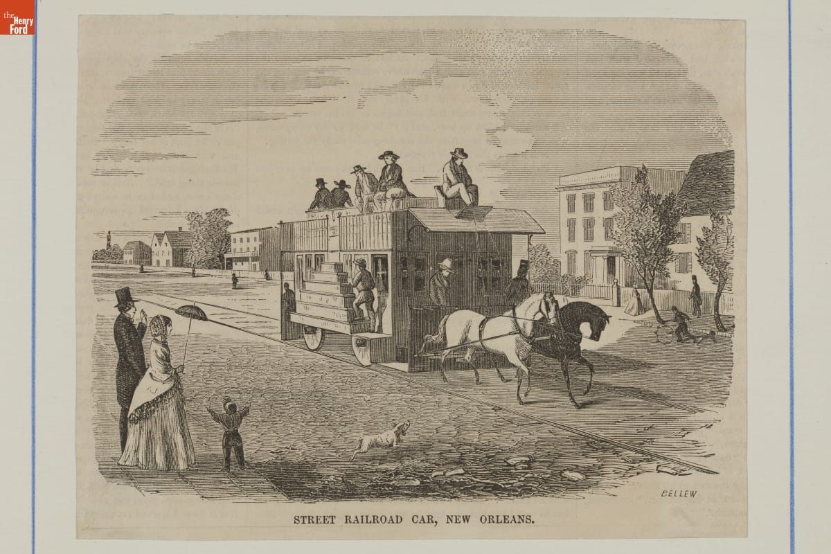 This 1855 wood engraving depicts a two-story horse-drawn street car on rails operating in New Orleans, Louisiana. A unique and primitive early example of a streetcar, it was designed to solely operate within the limits of one city.