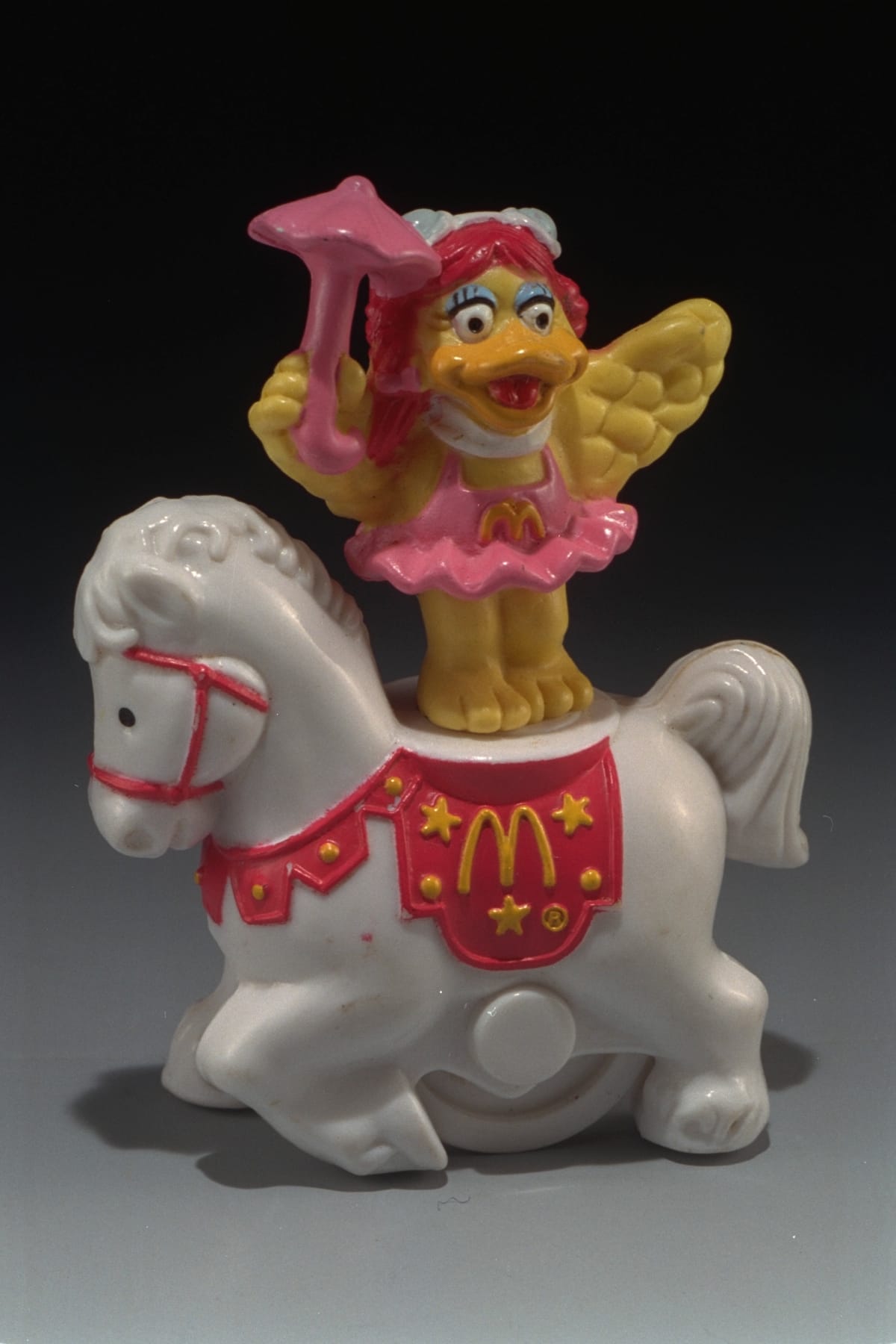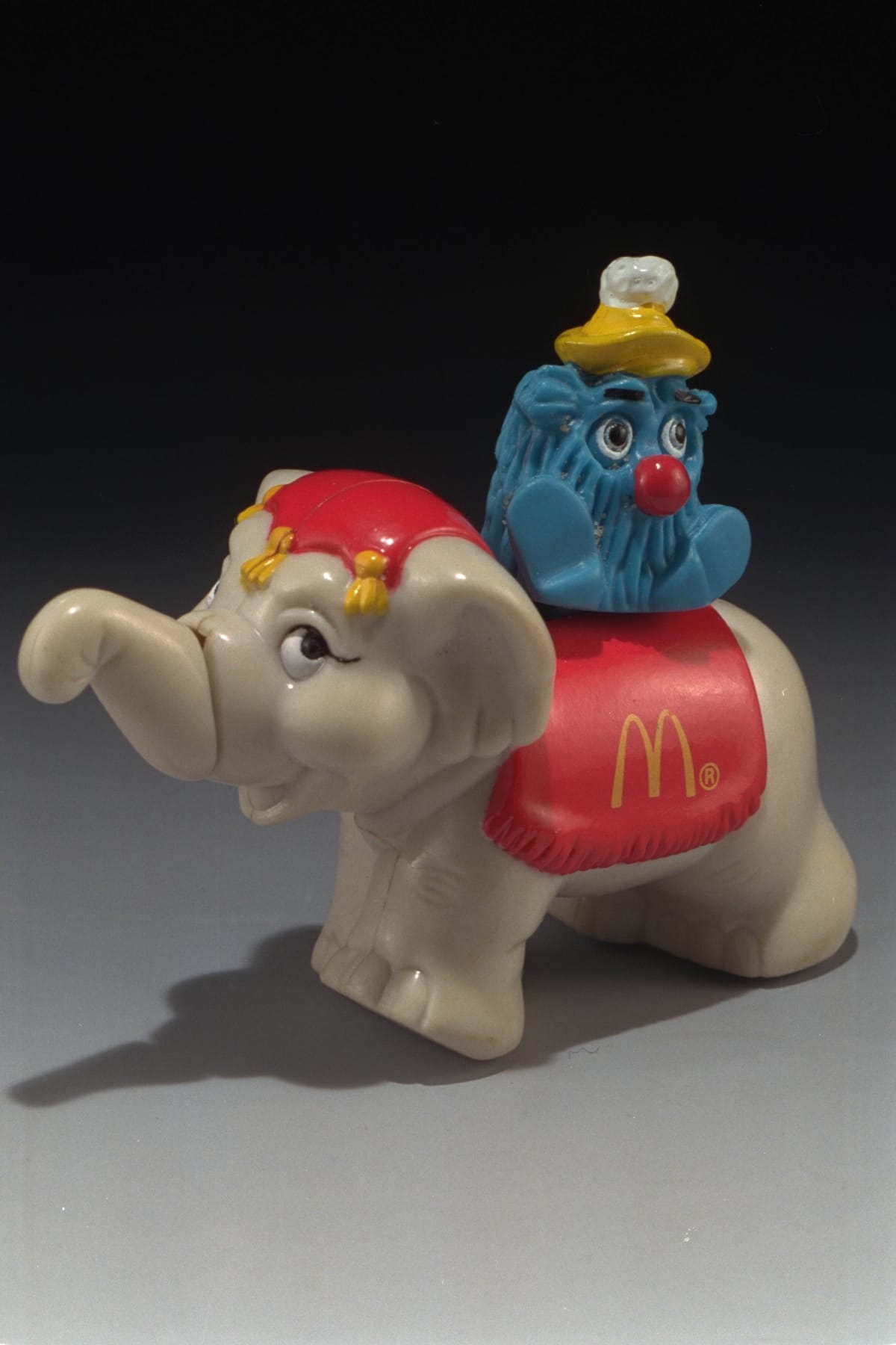 On June 11, 1979, McDonald's introduced its first national Happy Meal promotion. Called Circus Wagon, it included six different cardboard boxes designed to look like festively decorated circus wagons. McDonald's again brought back a circus theme with this March 8-April 12, 1991 St. Louis regional promotion of geared action toys. When this vehicle was moved, the figure would also move.