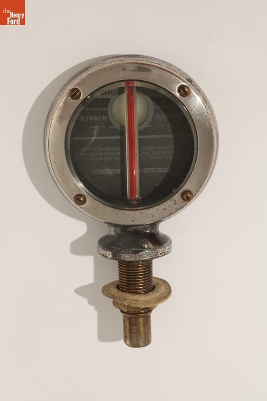 Automobiles often came without temperature gauges before the early 1930s, so enterprising manufacturers sold aftermarket motometers. Mounted on a car's radiator, these devices measured and displayed coolant water vapor temperature, notifying drivers if their automobiles were in danger of overheating. Moto-Meter Co. Inc. dominated the American market, producing the popular Boyce motometer and others featuring an automotive manufacturer's name or logo.