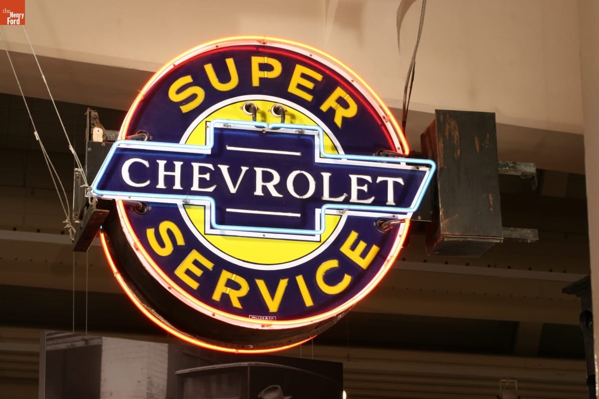 By the 1930s, many automobile dealerships also operated service garages offering routine maintenance and repairs. This sign advertised a Chevrolet dealer's "super service" to motorists.