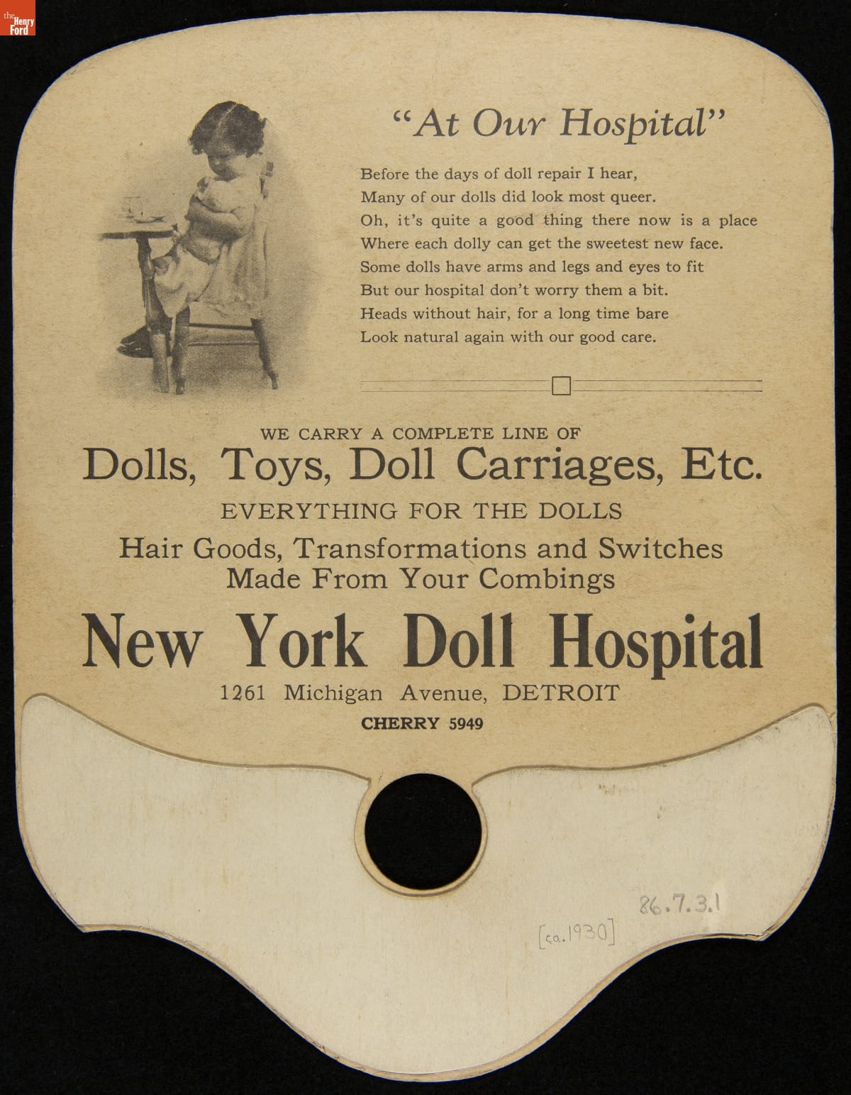This fan did more than create a refreshing breeze--it advertised! The New York Doll Hospital in Detroit, Michigan, distributed fans like this to promote its services. The toy shop made well-loved dolls new, replacing missing hair or broken parts. The shop also carried a line of dolls and doll accessories.