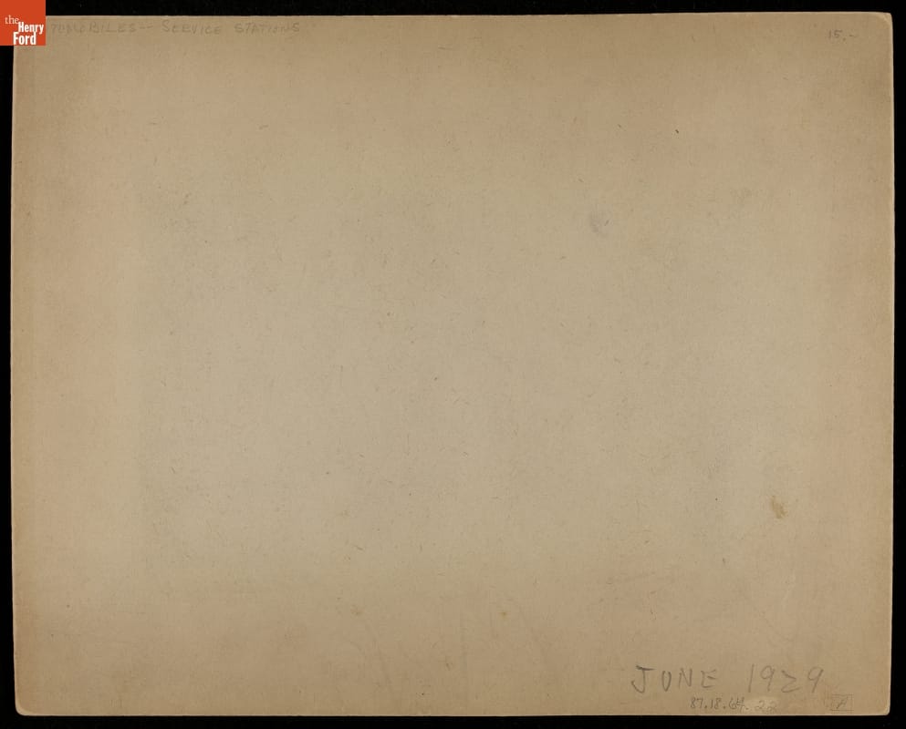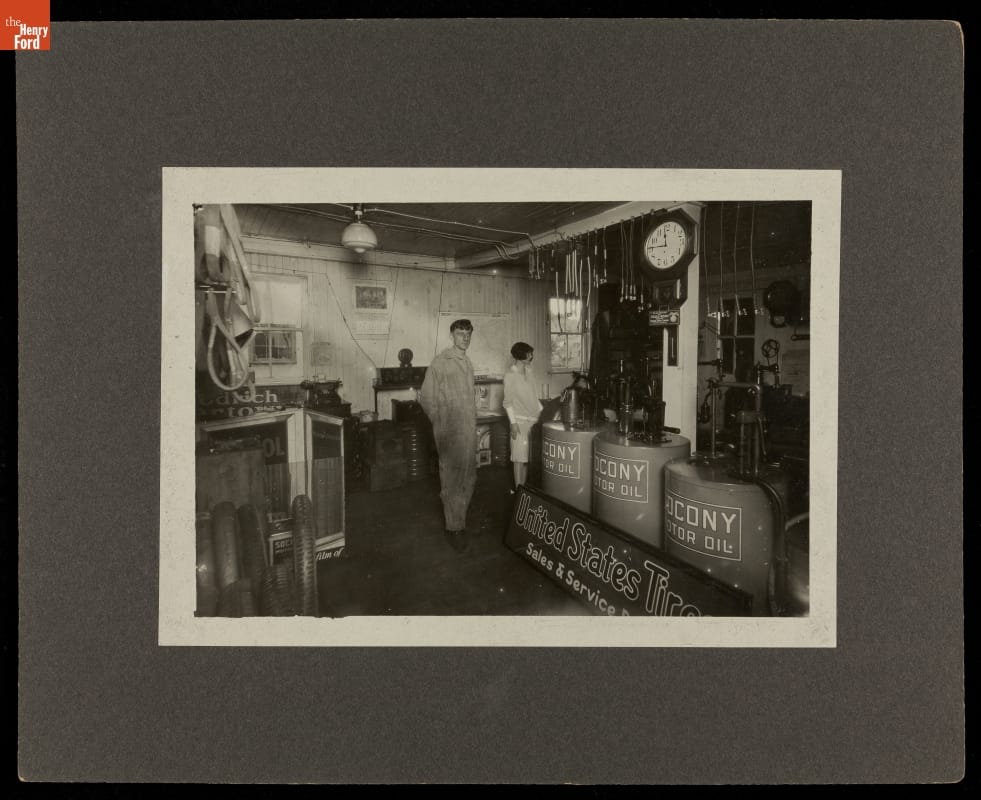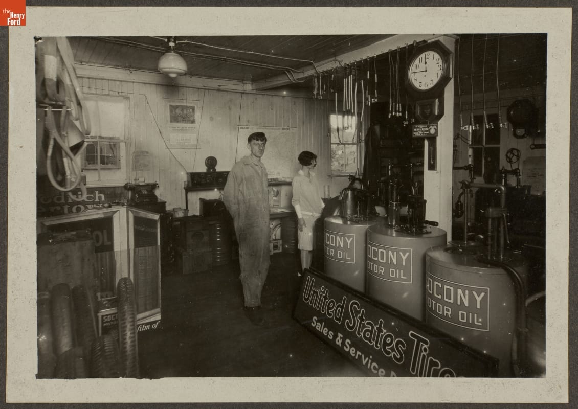 By the late 1920s, gas stations were fixtures in the American landscape. As the market became more crowded, gas itself was priced competitively, while stations made money on the "TBA" trinity of tires, batteries, and accessories. This interior shot of a Socony (Standard Oil Company of New York) station service bay is typical, featuring oil, tires, belts, and a radio.