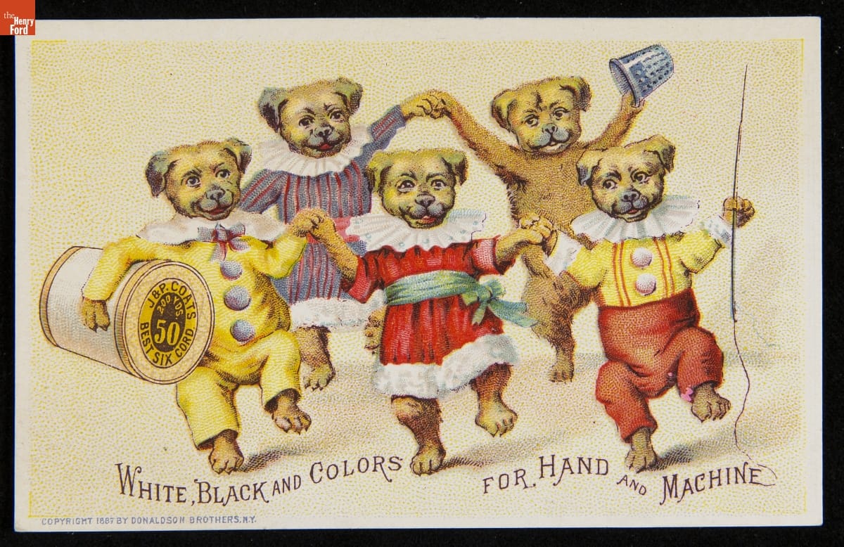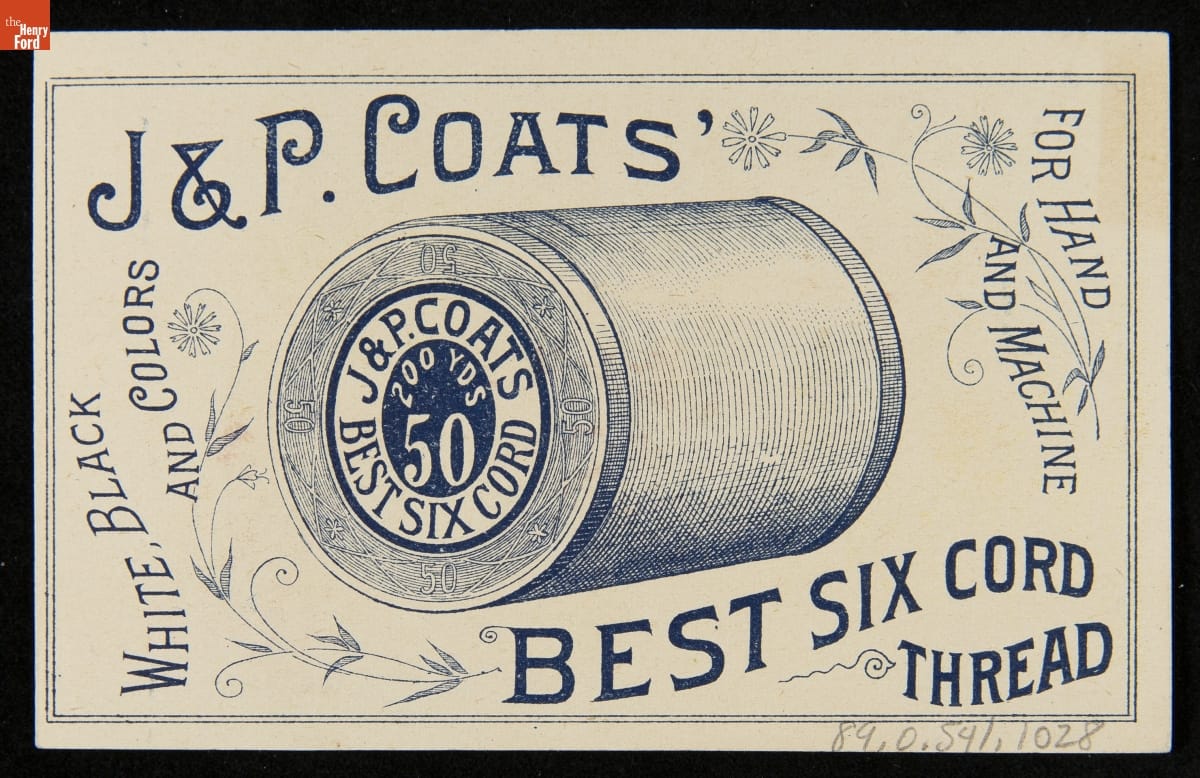 As color printing gained momentum in the late 19th century, trade cards became a major means of advertising goods and services. Americans enjoyed and often saved the little advertisements found in product packages or distributed by local merchants. This trade card advertises Six Cord Thread from J. & P. Coats Company.