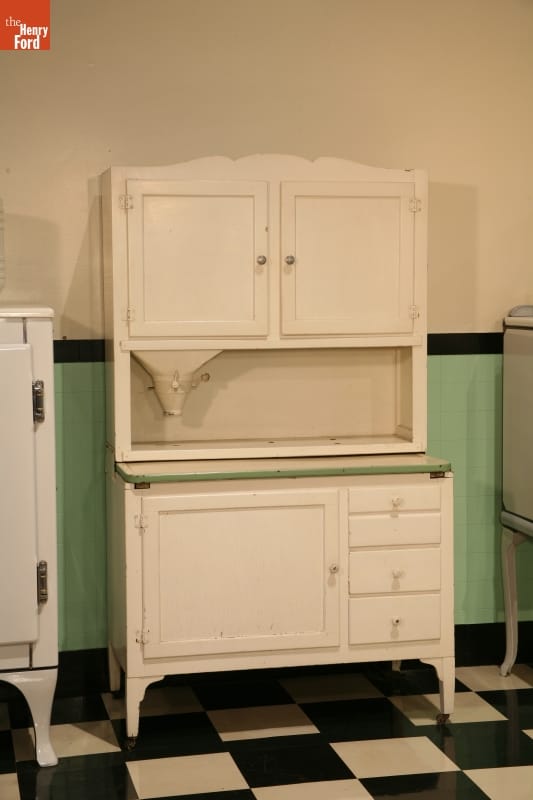 Early 20th century scientific management theories -- efficient, convenient, orderly work processes -- even influenced the home. This "Hoosier" style cabinet helped housewives organize food preparation. Baking supplies and kitchen utensils could be stored inside. The white enameled porcelain surface offered a convenient, sanitary workspace to mix ingredients or cut up food -- and then could easily be wiped clean.