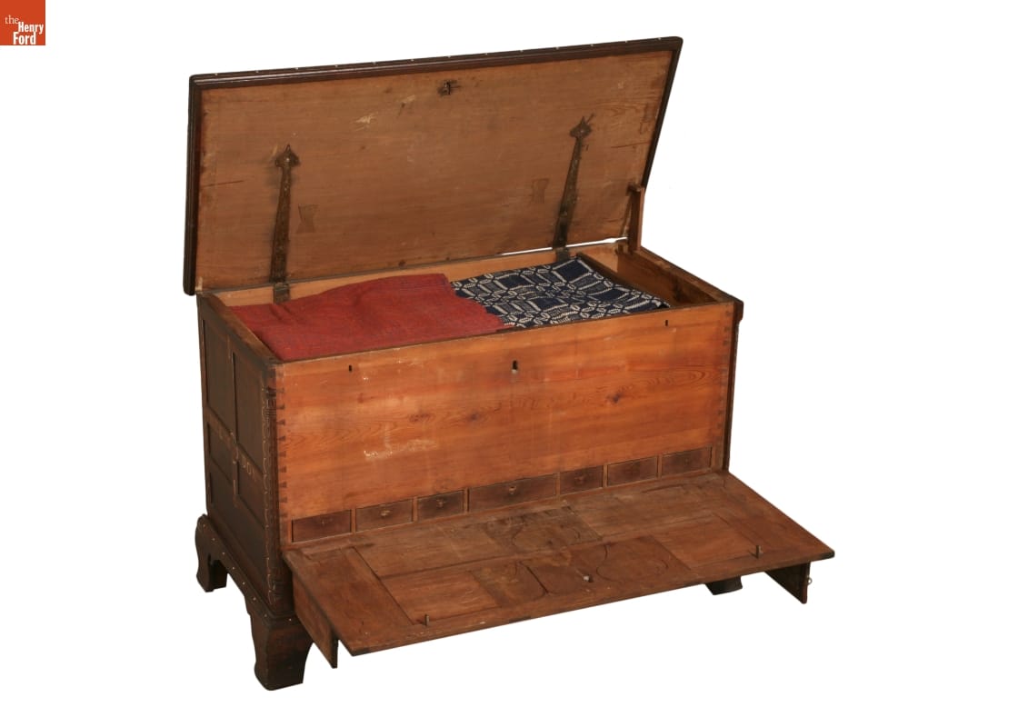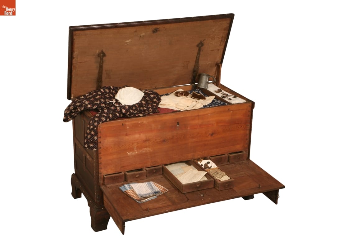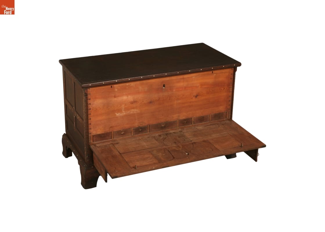 Storage space in most middle-class households was minimal by our standards, making chests like this a necessity for the family's storage needs. This chest's drawers and lid may be locked, assuring the family that their possessions were safely stored. The decorative front of this chest tilts to reveal a row of hidden drawers. These drawers likely held valuables and important correspondence.