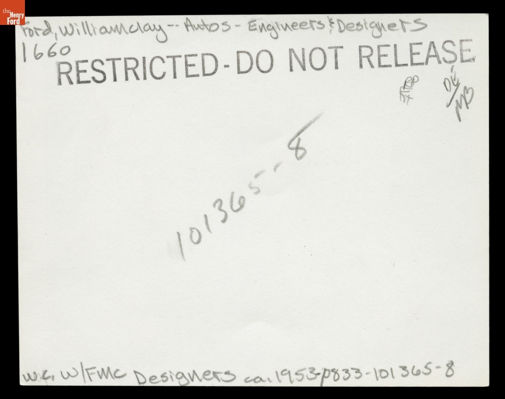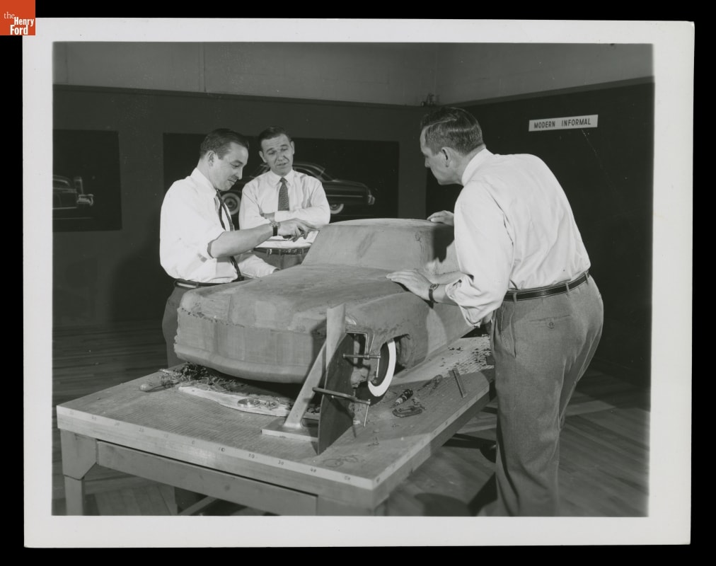 William Clay Ford (1925-2014) was Henry Ford's grandson and the youngest of Edsel and Eleanor Clay Ford's four children. In 1952, William headed a group that designed an elegant new edition of the classic Lincoln Continental that had been developed under his father Edsel's direction. Here, William (left) is one of three onlookers viewing a model of the proposed automobile.