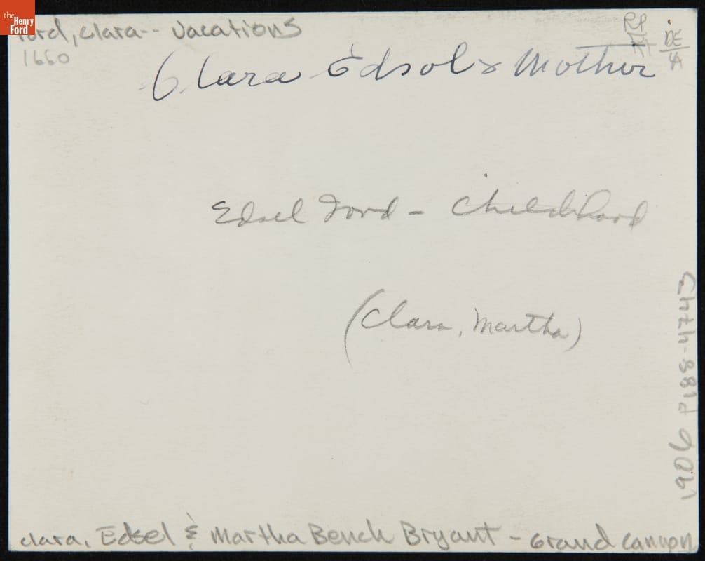 A 1906 trip took the Ford family, along with Clara Ford's mother, to Southern California where they visited Clara's sister in Altadena. During a stop along the way, a young Edsel got his first view of the Grand Canyon. Edsel visited the canyon at least three more times in his life, returning with family, friends and on his honeymoon.