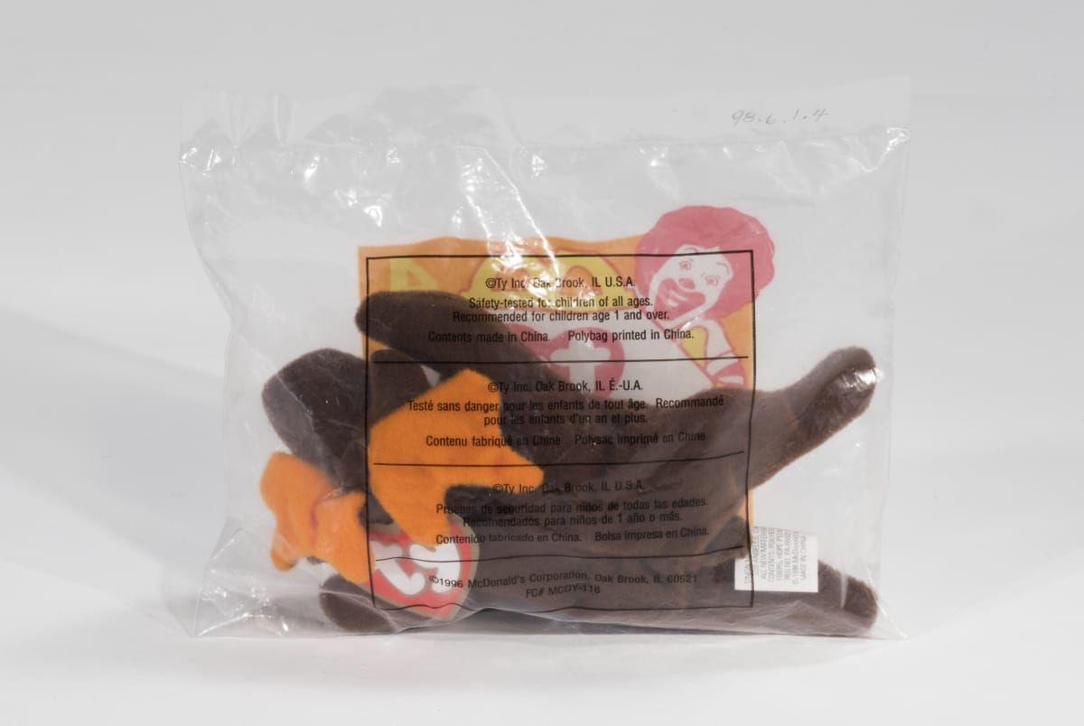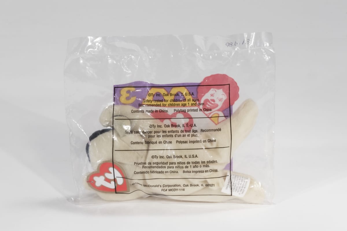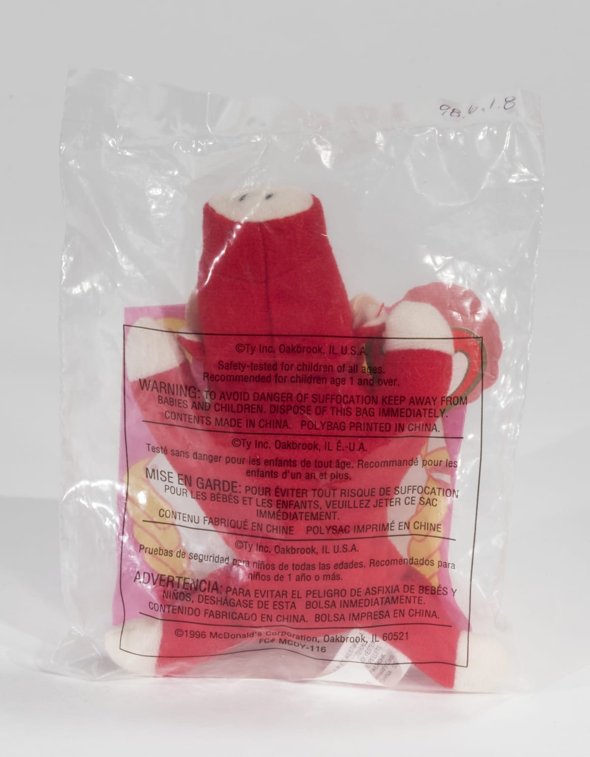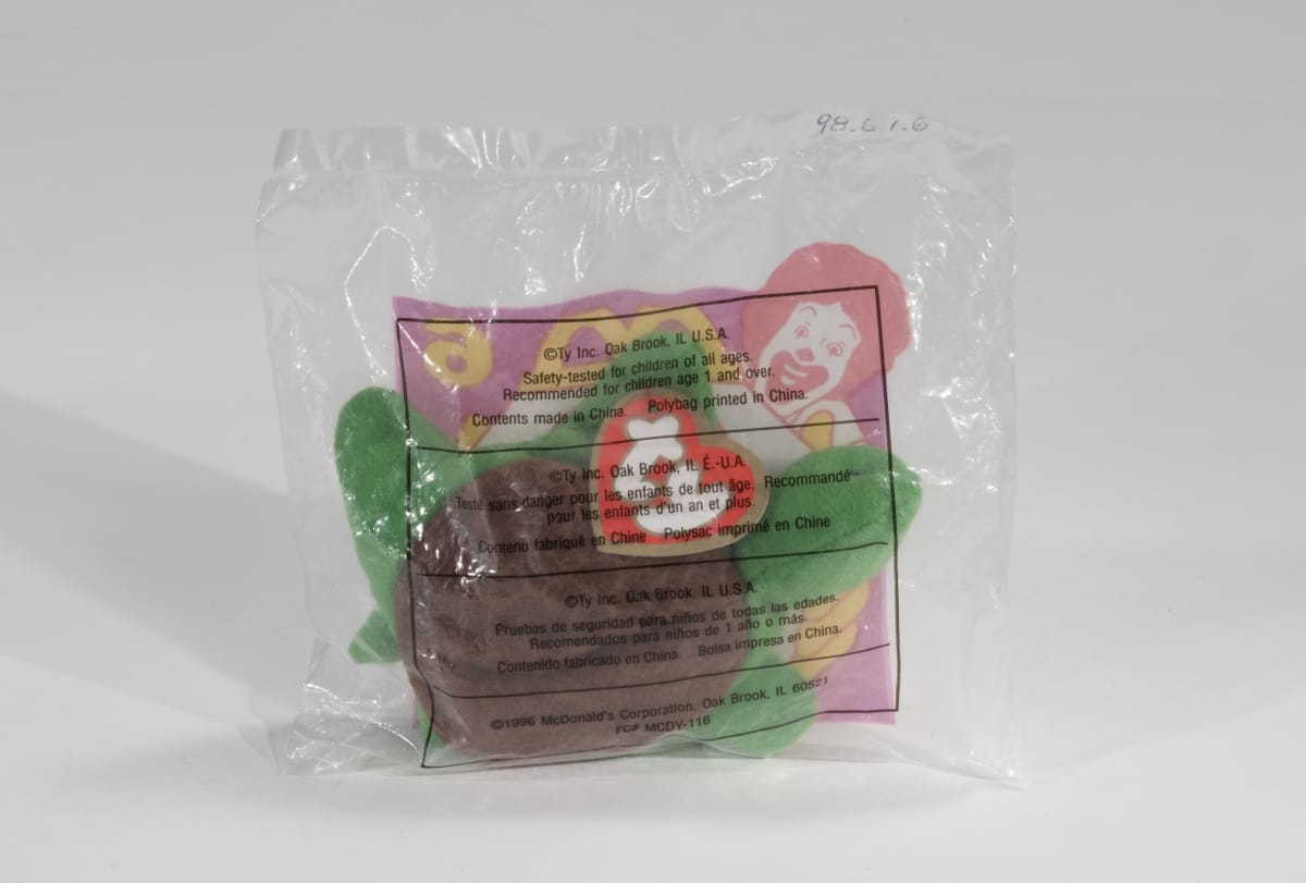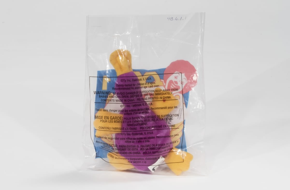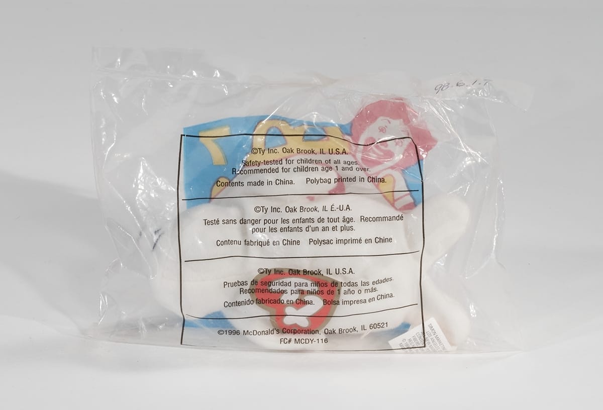 Ty Inc. Oakbrook, IL U.S.A. / Safety-tested for children of all ages. / Recommended for children age 1 and over. / WARNING:TO AVOID DANGER OF SUFFOCATION DEEP AWAY FROM / BABIES AND CHILDREN. DISPOSE OF THIS BAG IMMEDIATELY. / CONTENTS MADE IN CHINA. POLYBAG PRINTED IN CHINA. / 1996 McDonald's Corporation, Oakbrook, IL 60521