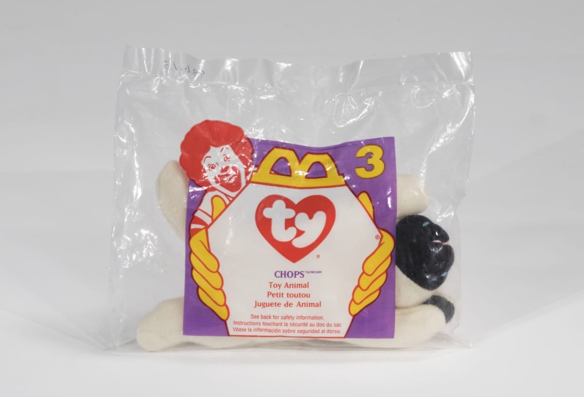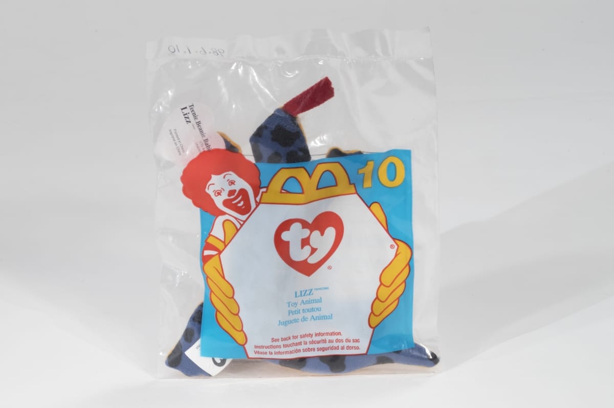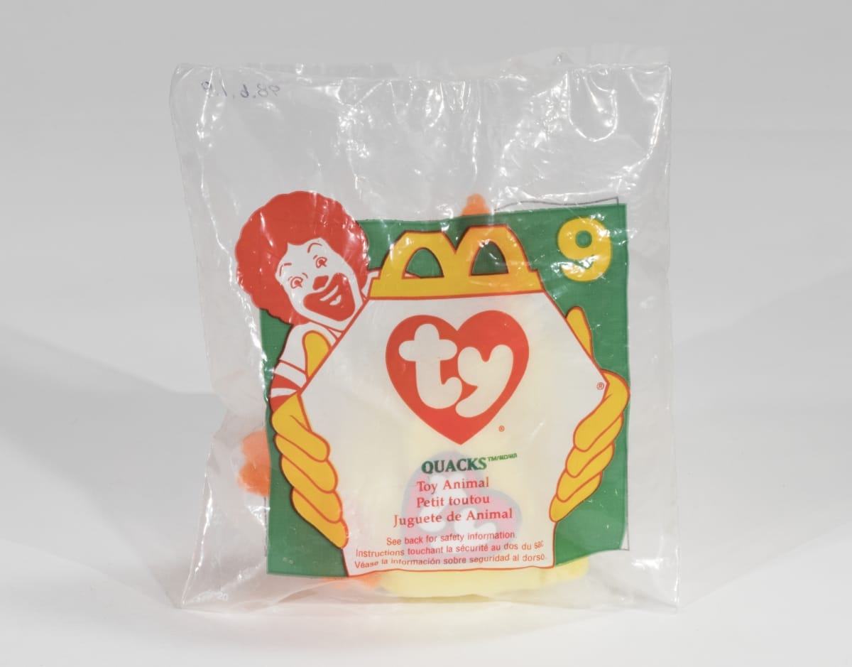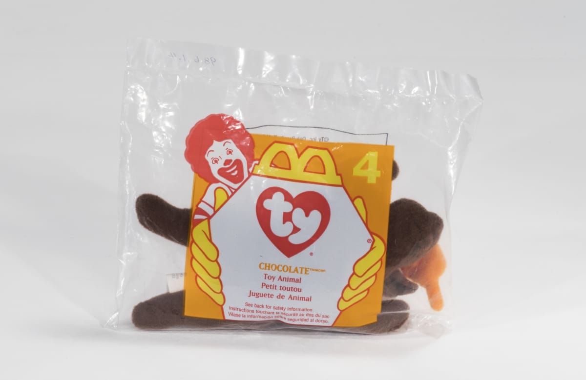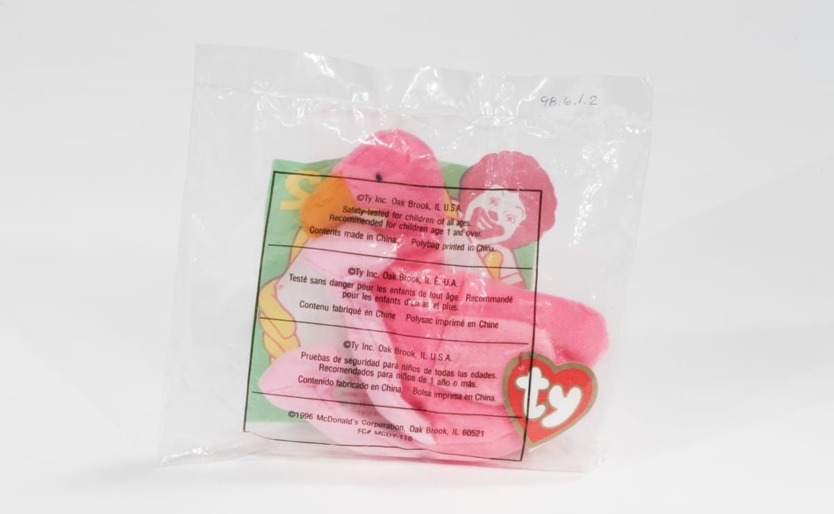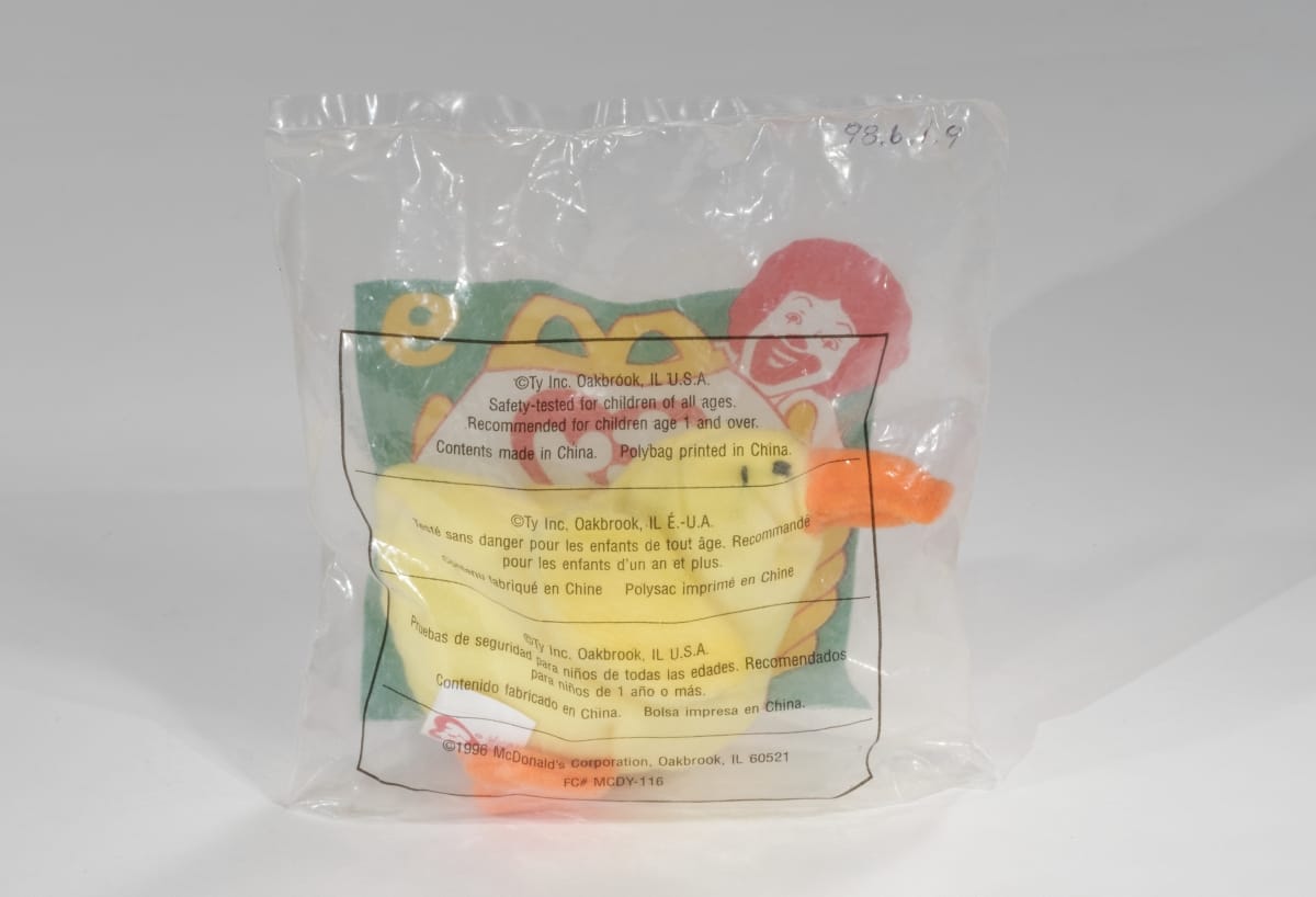 Ty Inc. Oakbrook, IL U.S.A. / Safety-tested for children of all ages. / Recommended for children age 1 and over. / WARNING:TO AVOID DANGER OF SUFFOCATION DEEP AWAY FROM / BABIES AND CHILDREN. DISPOSE OF THIS BAG IMMEDIATELY. / CONTENTS MADE IN CHINA. POLYBAG PRINTED IN CHINA. / 1996 McDonald's Corporation, Oakbrook, IL 60521