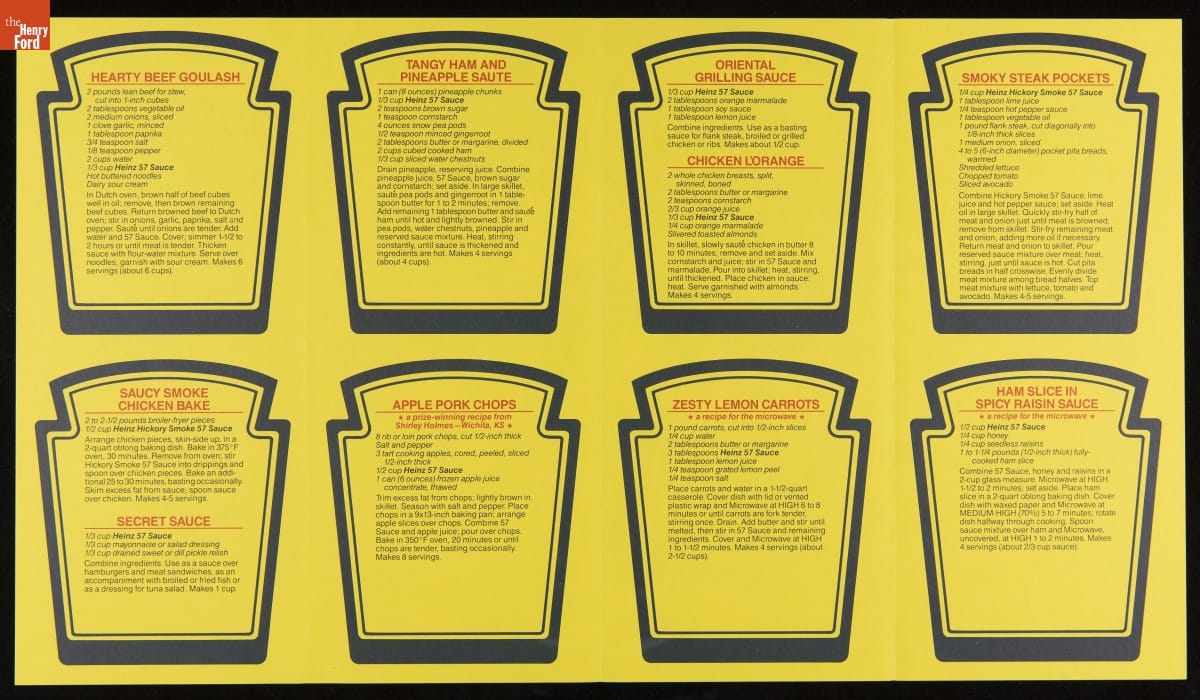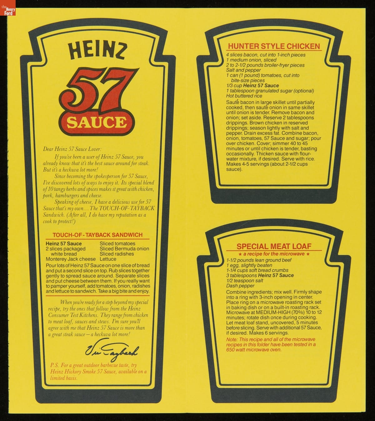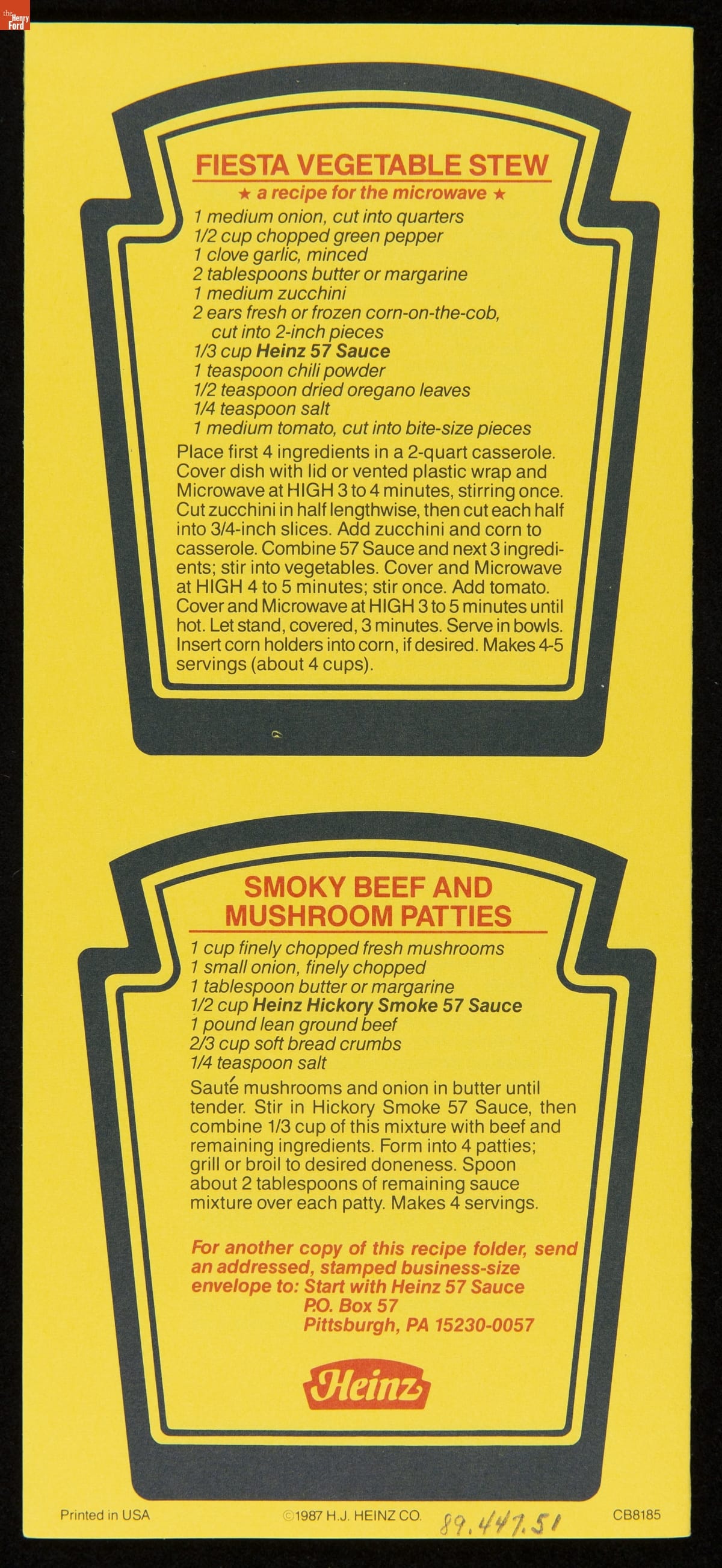 Like other manufactured food companies, the H.J. Heinz Company produced recipe booklets and publications to promote their products. This leaflet from 1987 features recipes for dishes utilizing Heinz 57 Sauce.
