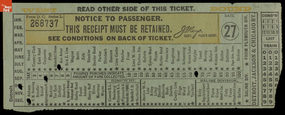 Passenger Ticket for Streetcar Travel on the Detroit, Jackson & Chicago Railway, circa 1925